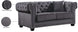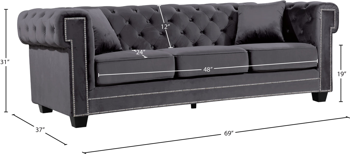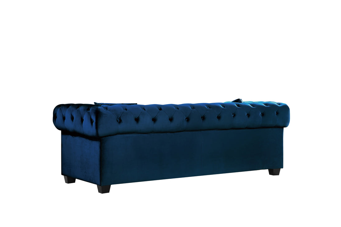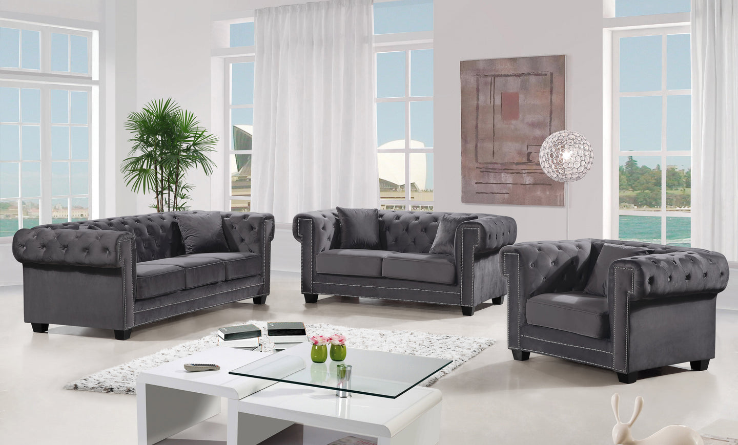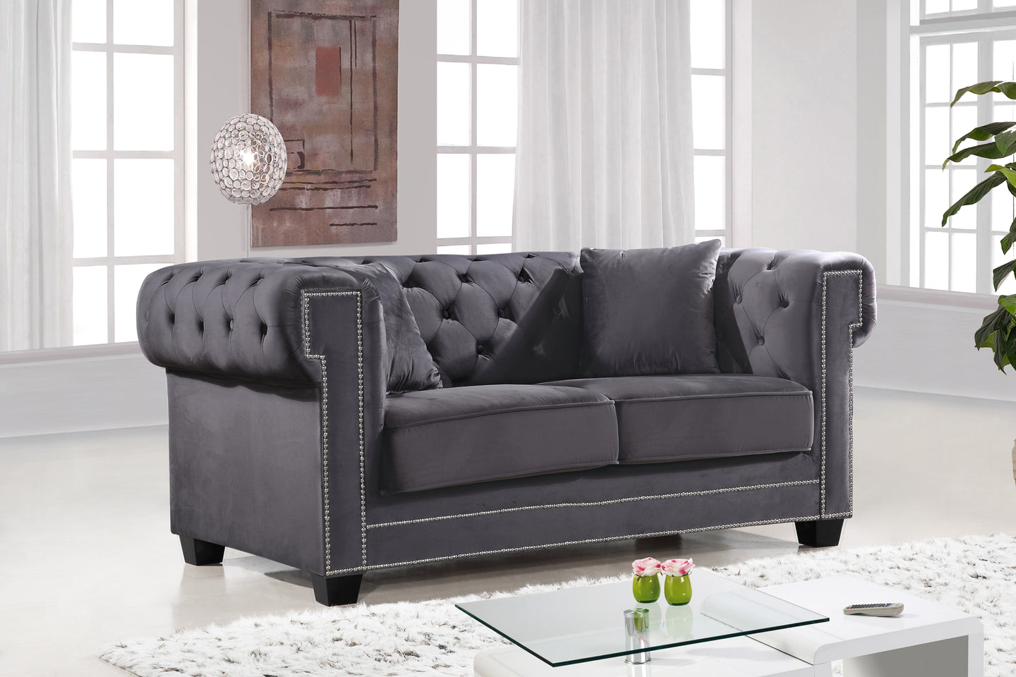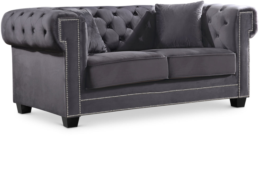 The Bowery Collection by Meridian Furniture. Features beautifully designed tufted velvet upholstery with custom wood legs and a nail head trim. This collection is guaranteed to be the highlight of any home. Throw pillows included.