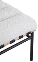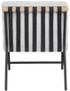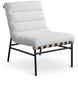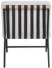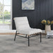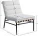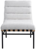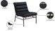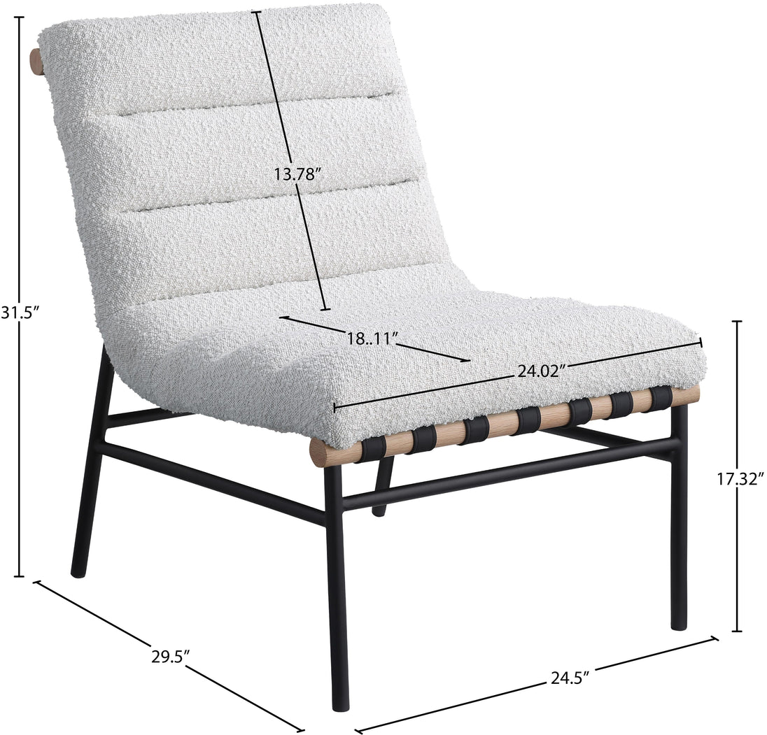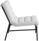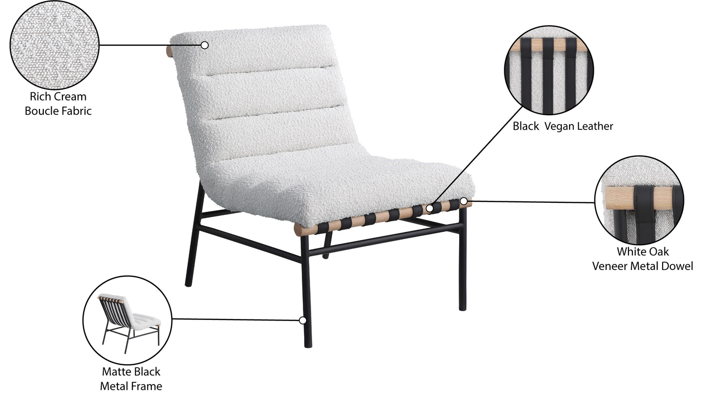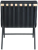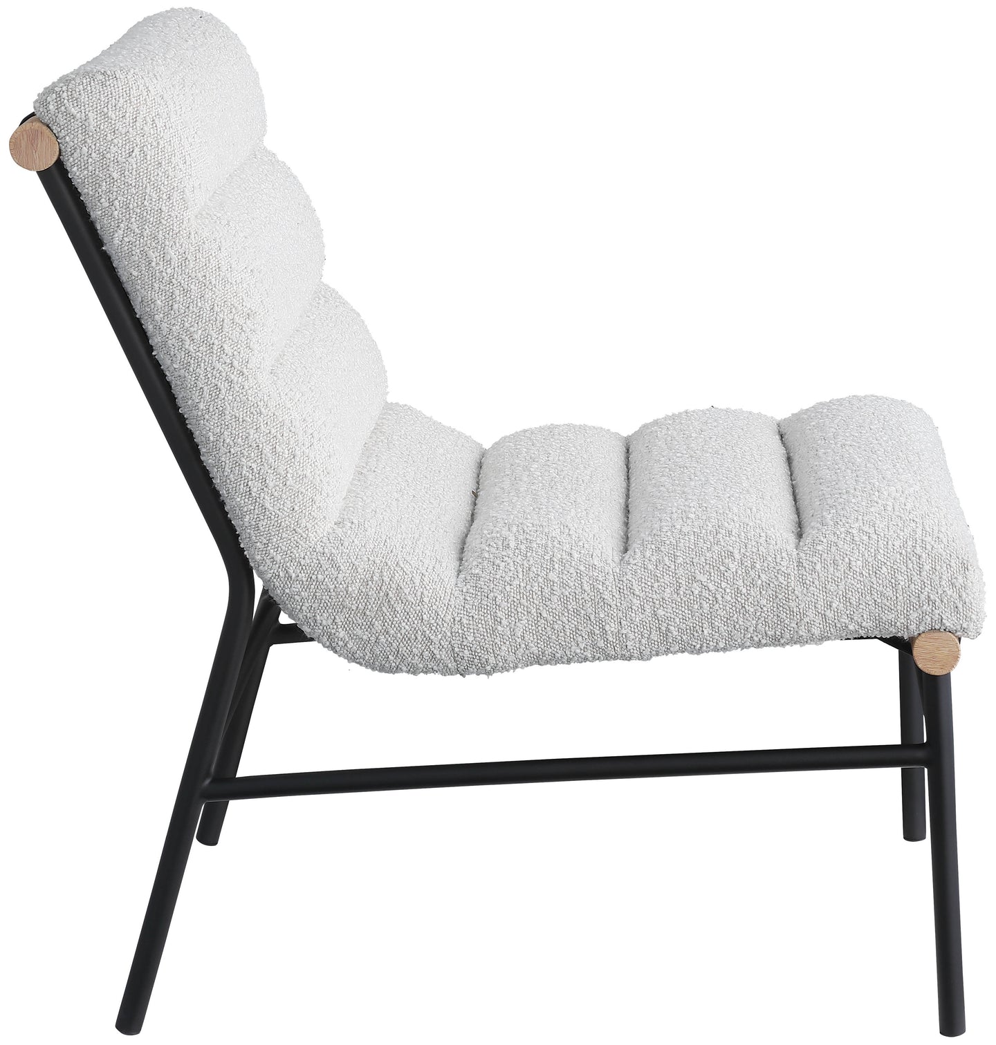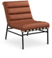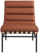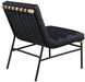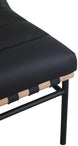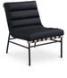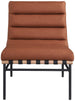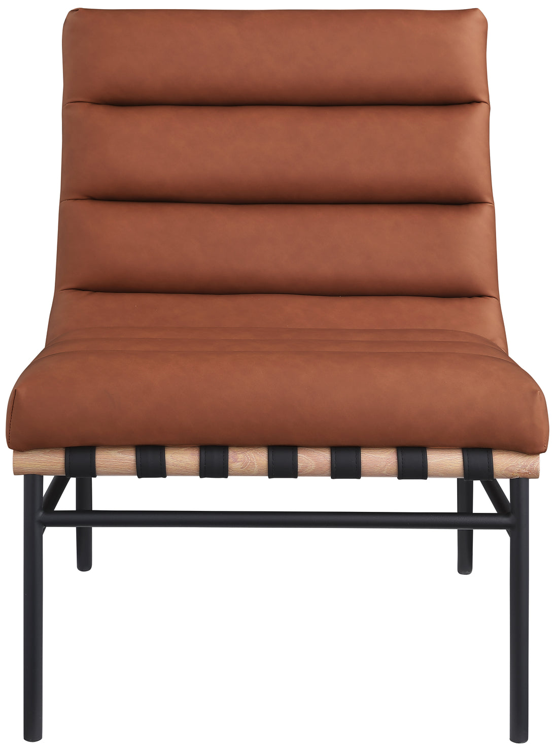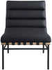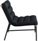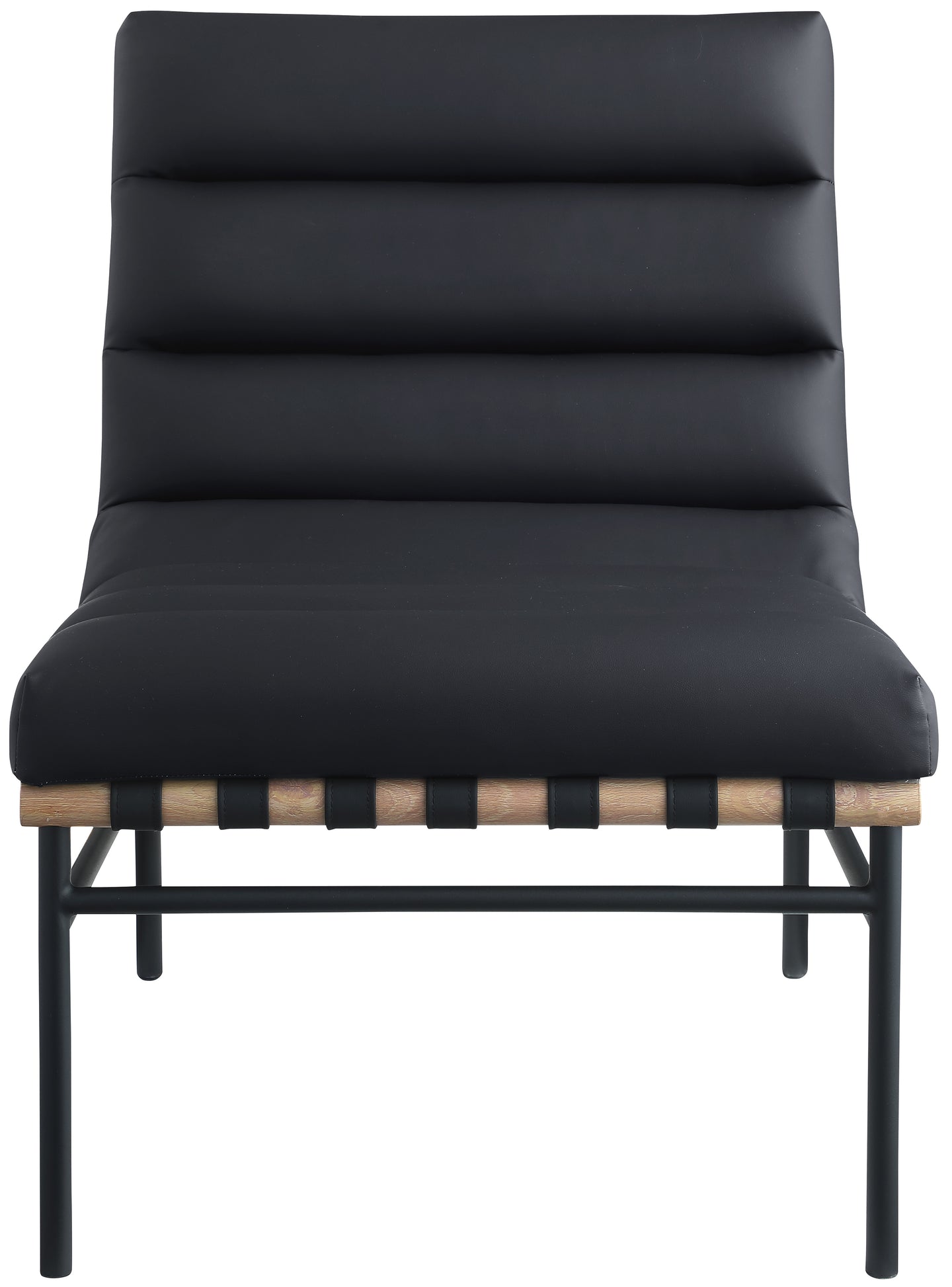 Keep it casual with this Burke vegan leather accent chair. This eye-grabbing chair has an uber laid-back vibe with its armless design and slightly reclined back. Soft black vegan leather feels great against the skin and provides the look of leather without the expense. An overstuffed, channel-tufted seat and back cushion make it super comfy and ready for evenings spent relaxing and taking it easy. An all-metal frame provides support for durable use, and a white oak veneer metal dowel provides interesting contrast to draw the eye instantly from all angles.