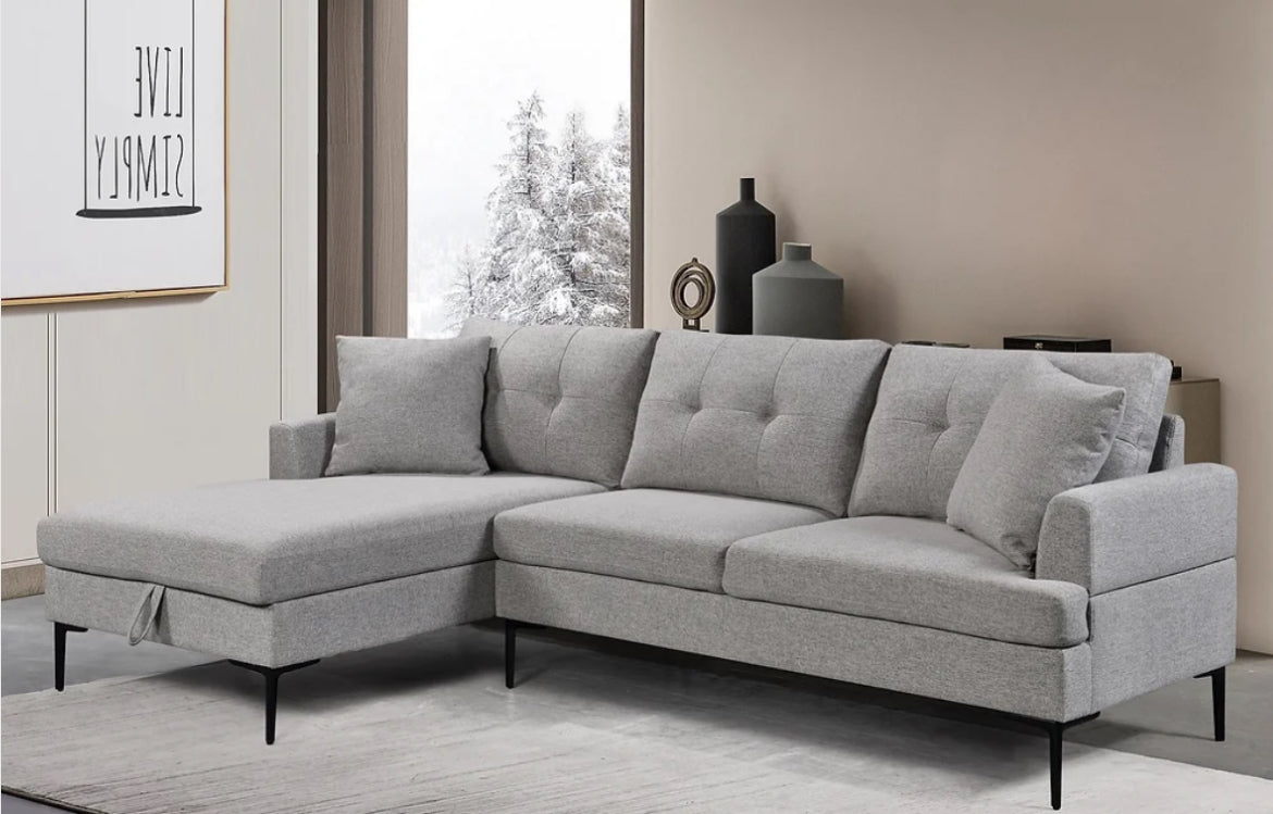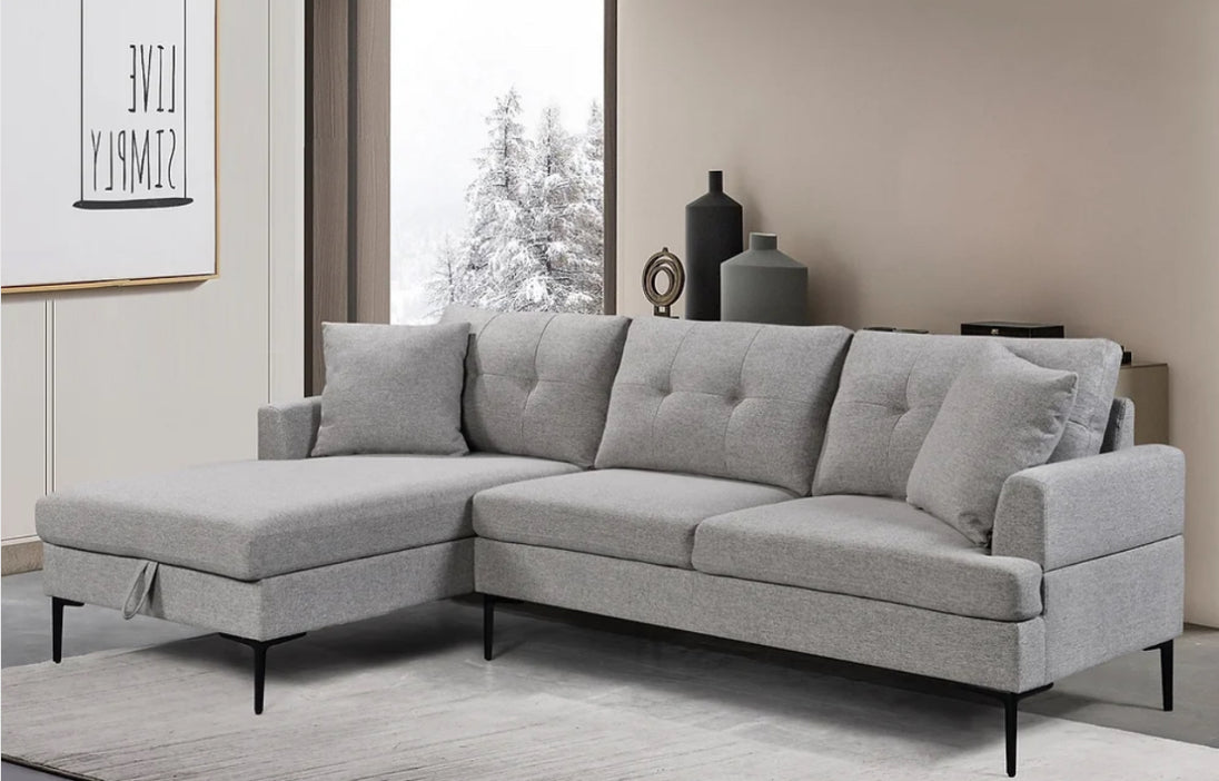 Grey Fabric Sectional Sofa with Storage Chaise and Accent Pillows