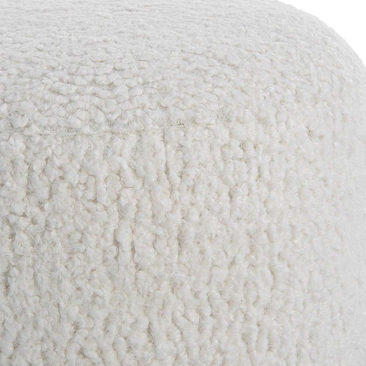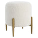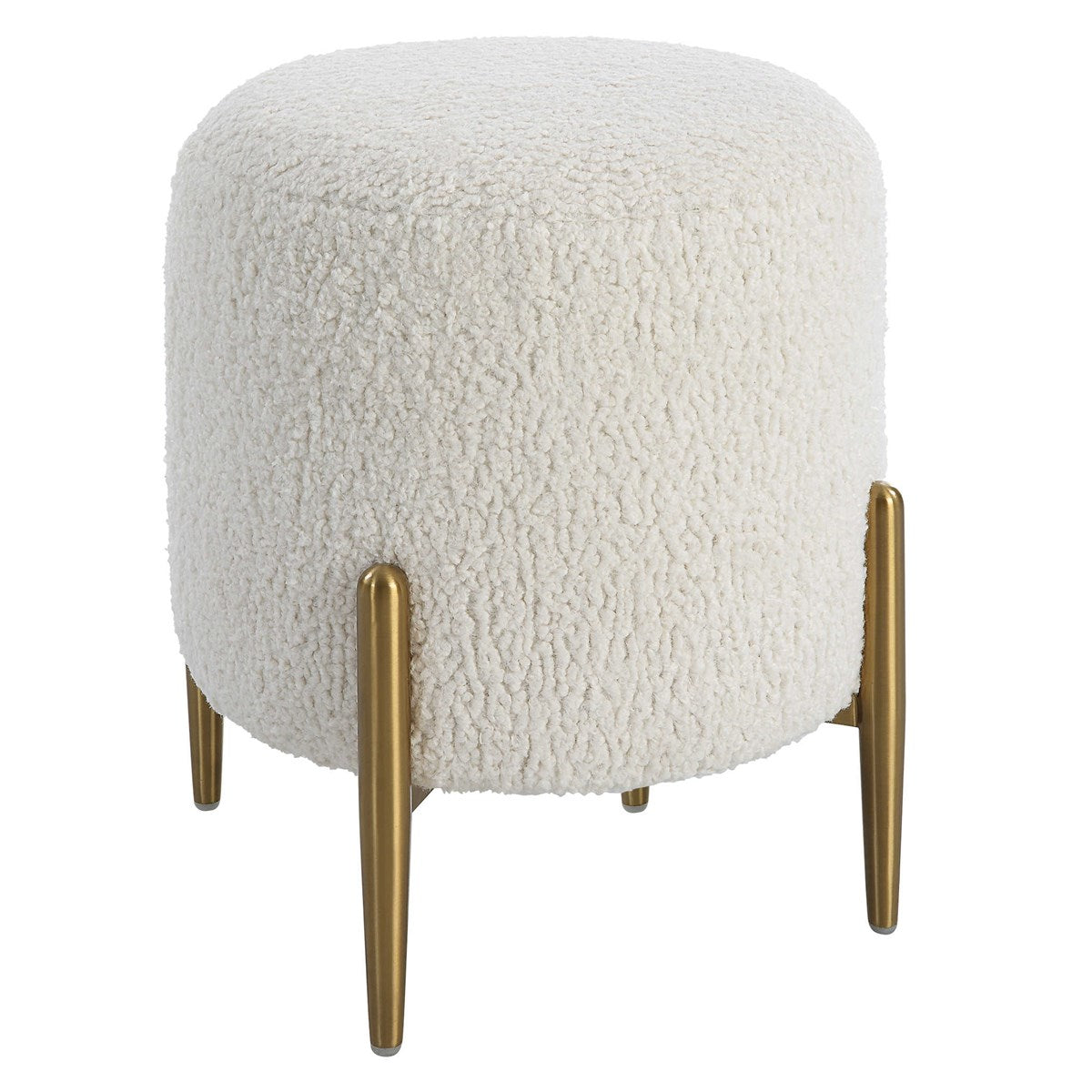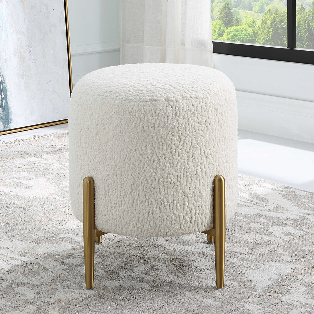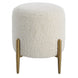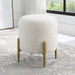 This plush ottoman is covered in a luxurious white faux shearling, suspended within brushed brass finished metal legs. Versatile and stylish, this piece can be used as a seat or footrest, grouped together or as a singular accent piece.