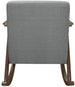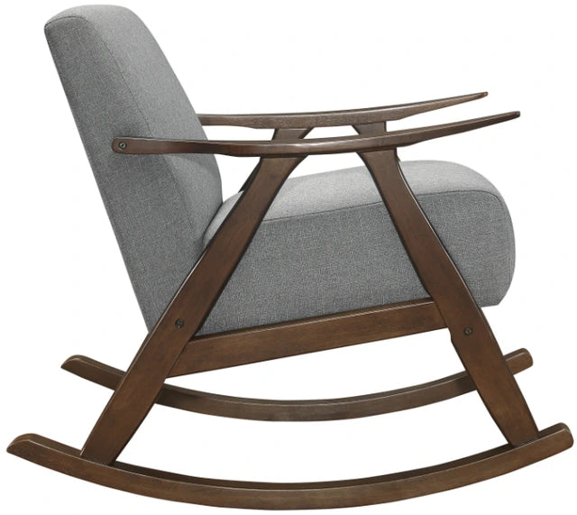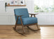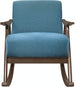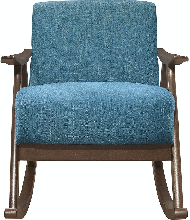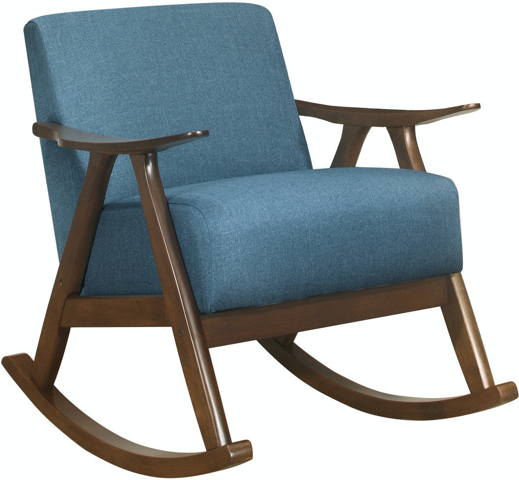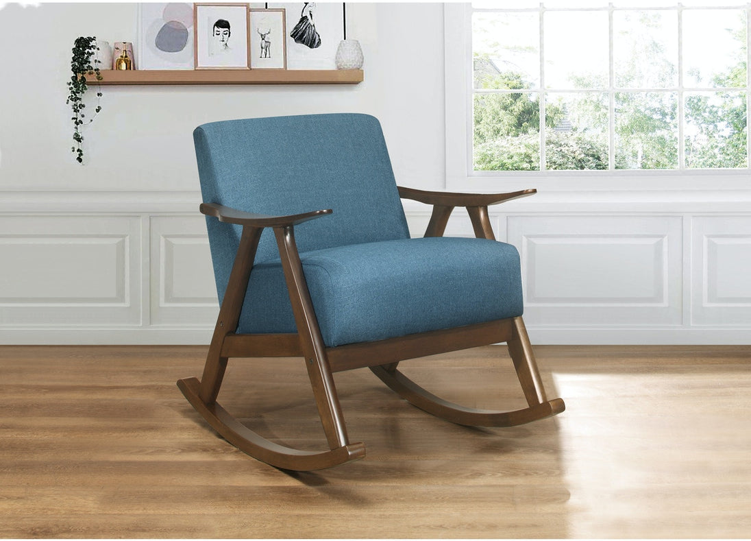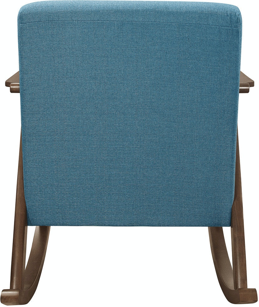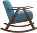 The frame of the Waithe Collection recalls a time when simplicity of profile was the height of style. The streamlined design of the rocking chair features subtly sloped wood arms, legs and rails that are finished in dark walnut, serving to highlight the blue seat covering.