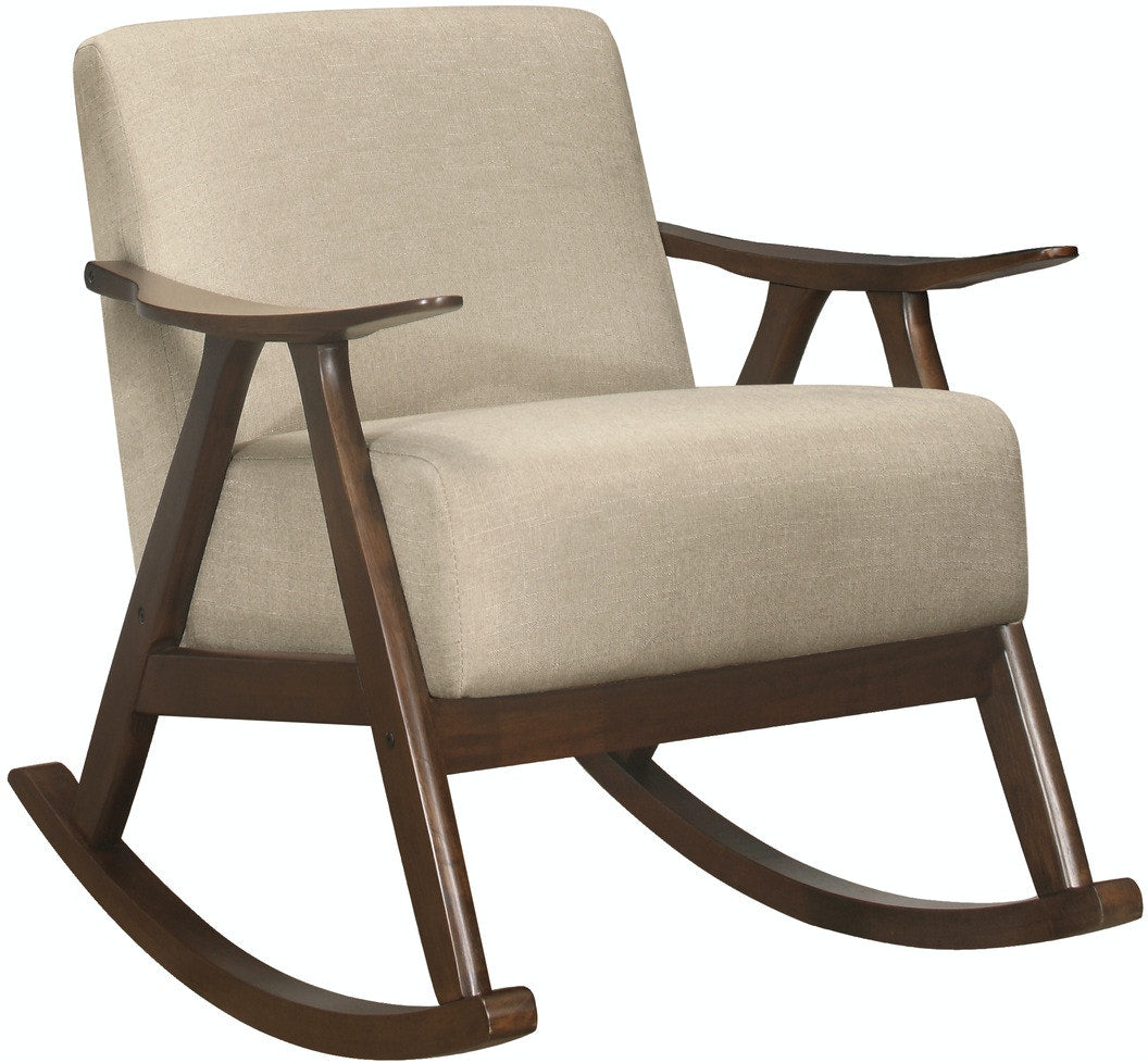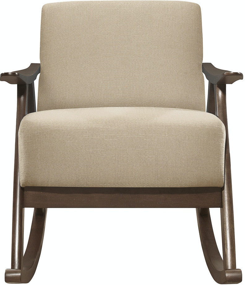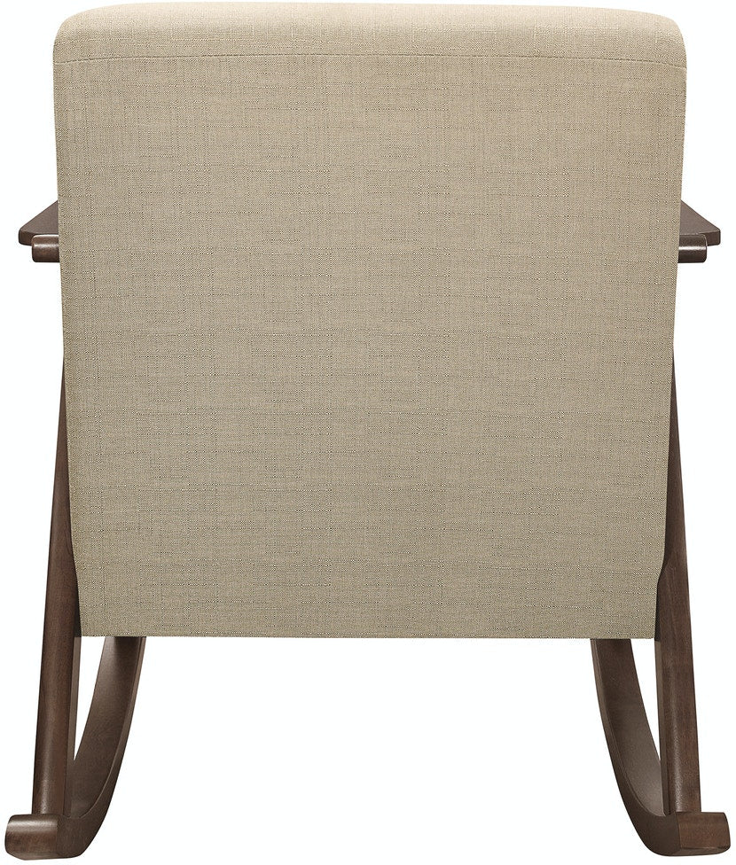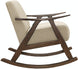 The frame of the Waithe Collection recalls a time when simplicity of profile was the height of style. The streamlined design of the rocking chair features subtly sloped wood arms, legs and rails that are finished in dark walnut, serving to highlight the brown seat covering.