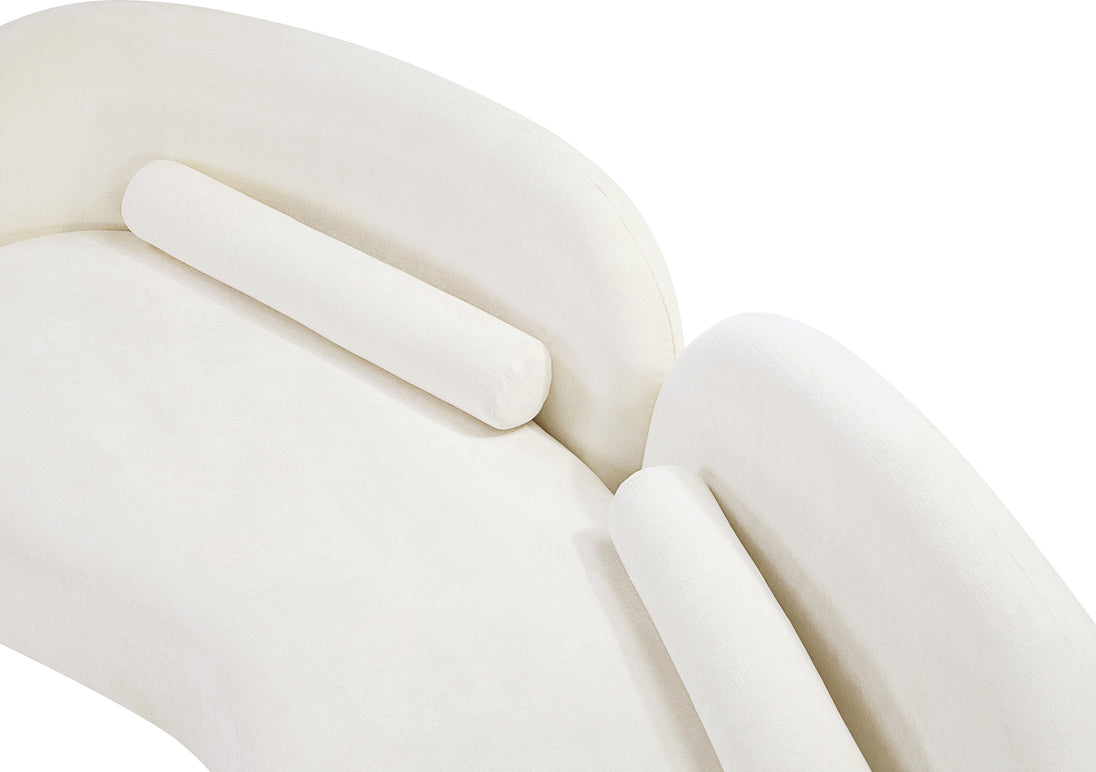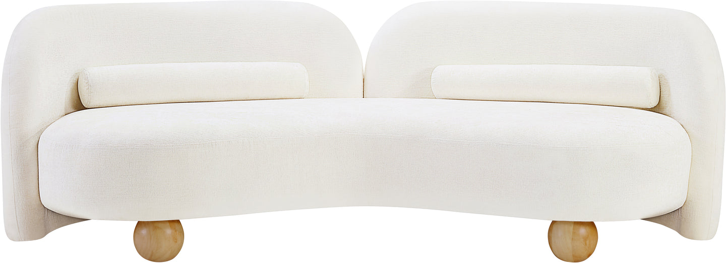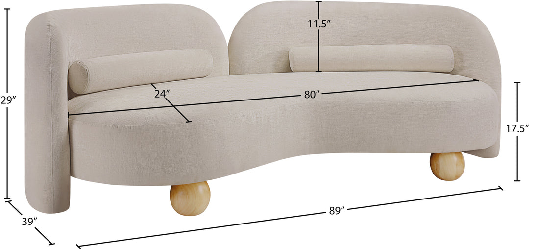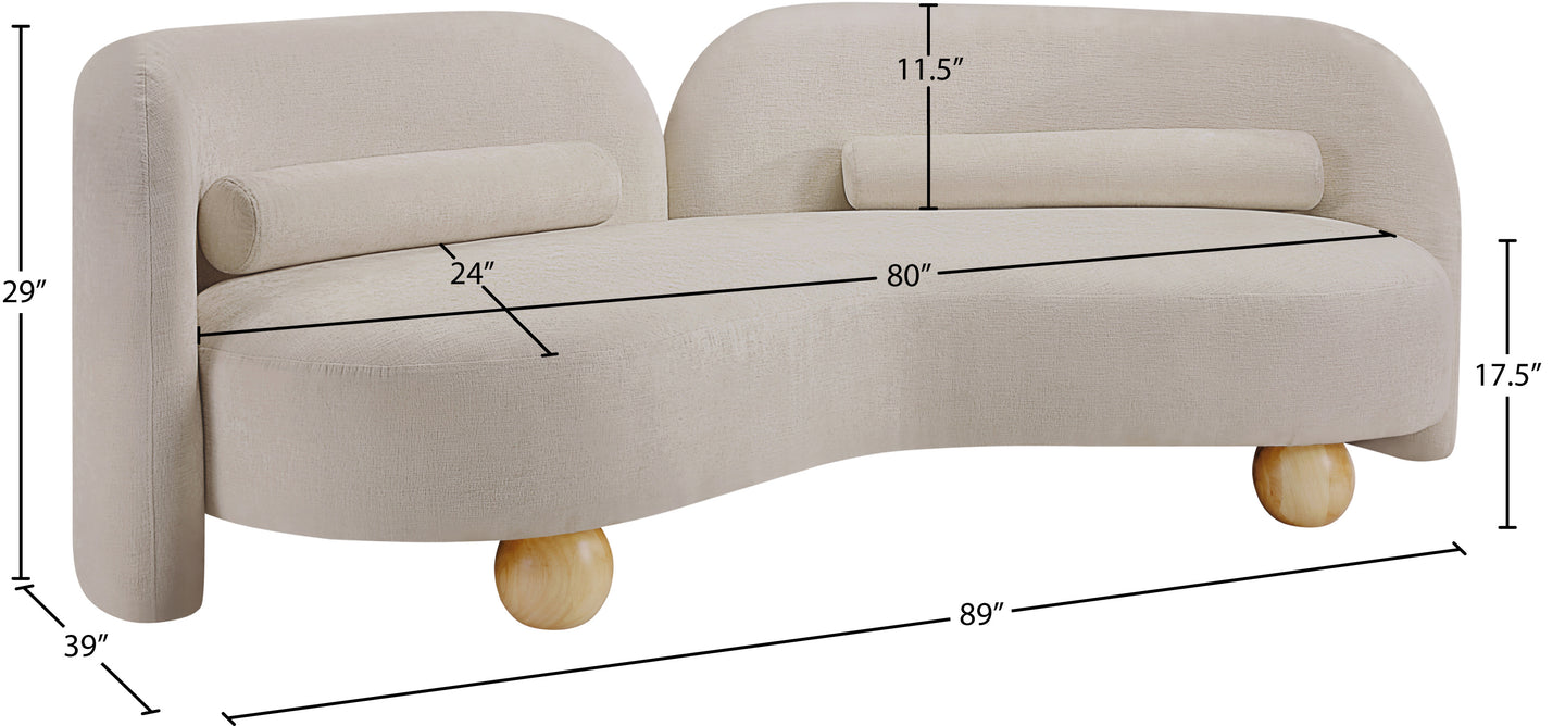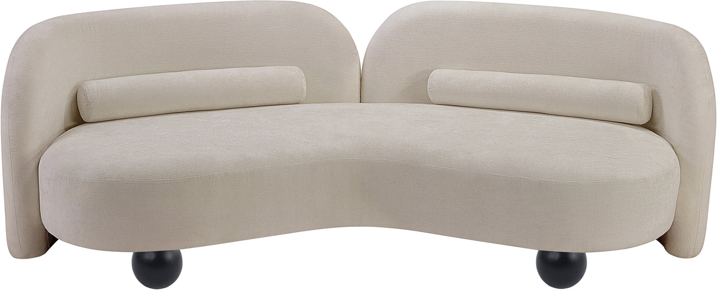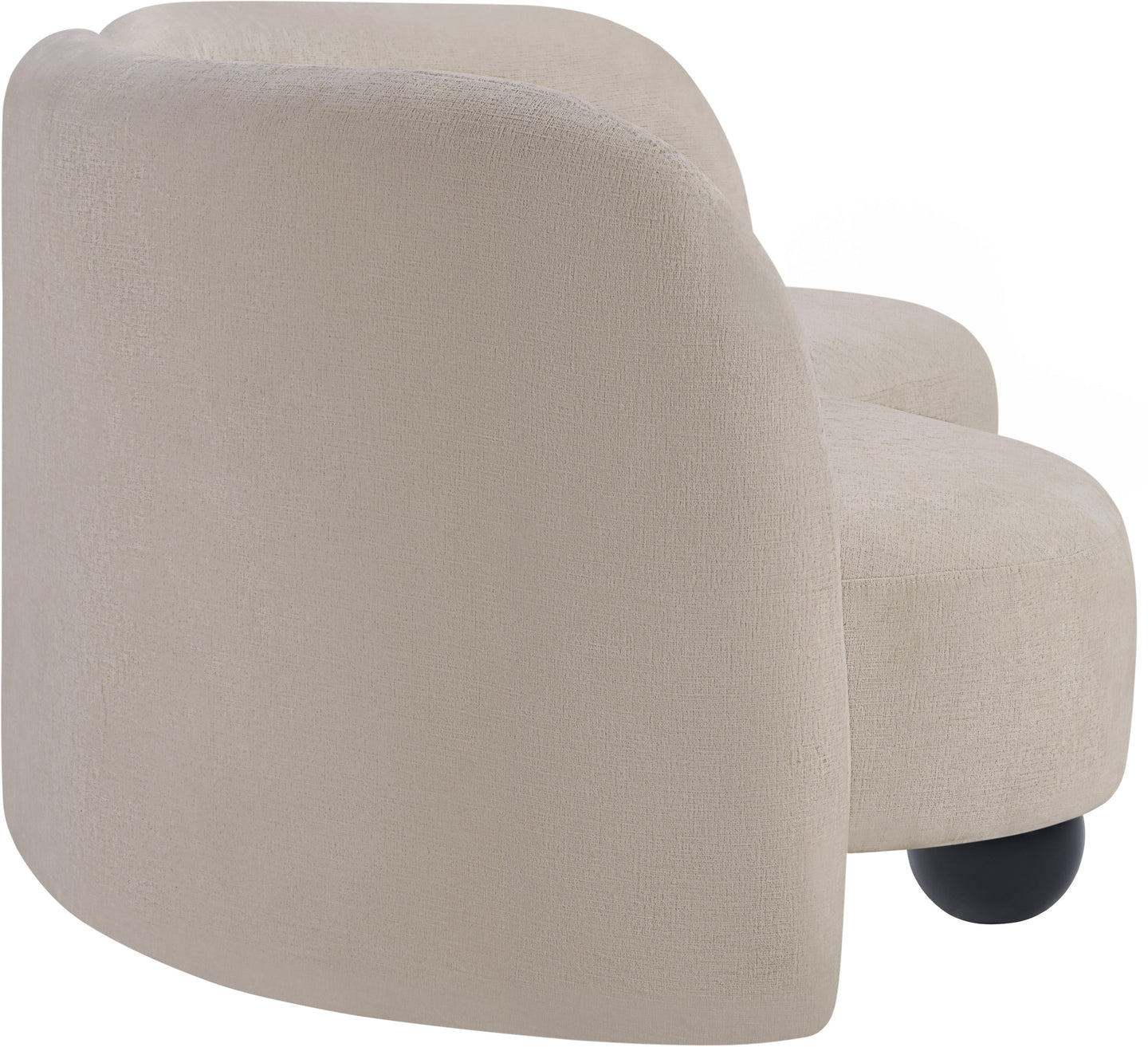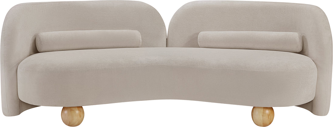 A cloud-like oasis of comfort, the Daphne beige chenille sofa is a modern sensation. Its plush upholstery invites you to sink in and relax, while the curved design offers both support and opulence. The sofa's unique silhouette is complemented by a choice of black or natural wooden legs, allowing you to customize it to your personal taste. Whether you're looking for a stylish accent piece or a comfortable spot to unwind, the Daphne sofa is the perfect choice.