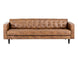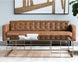 This attractive mid-century designed sofa is a timeless addition to any space. Sits comfortably in our light and dark grey fabric, or in a vintage-look havana dark brown and tobacco tan faux leather with button tufting and piping detail. Finished with black tapered wood legs. Includes two rolled cushions. Handle With Care: This design has been crafted with faux leather. Faux leather is manufactured to reflect the natural characteristics of leather; as such, colour variations, markings, wrinkles, grooves, and light scratches are appreciated characteristics. No two pieces will be alike. Visit our Product Care page for more information on how to ensure the lasting beauty of this piece.