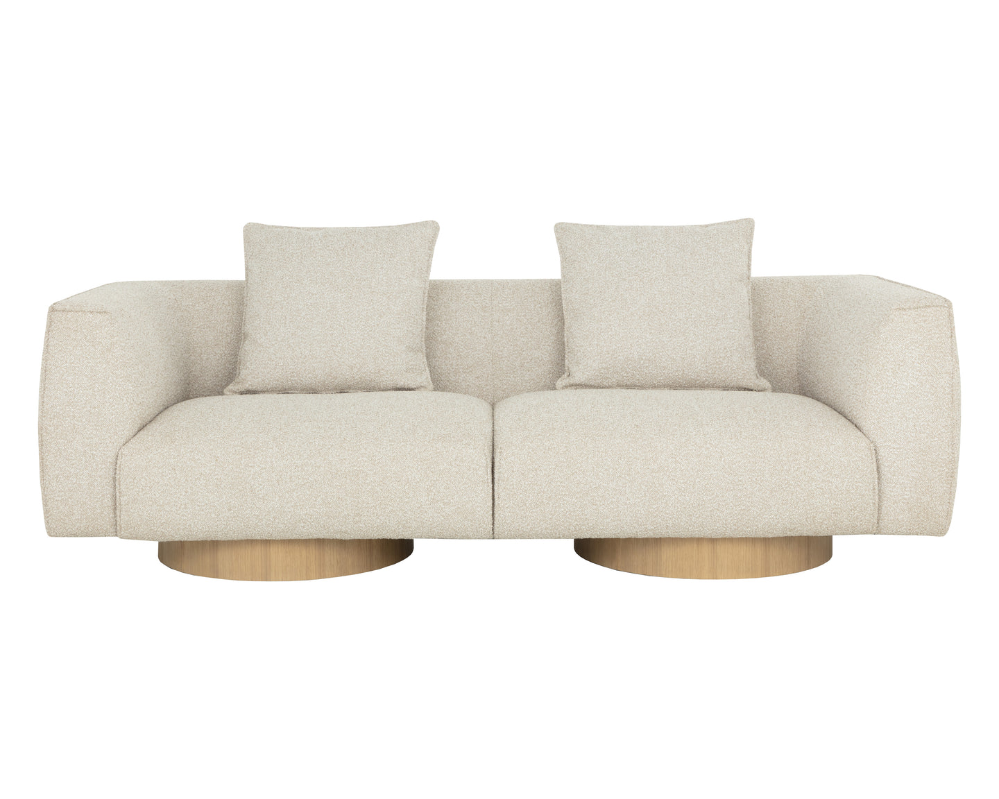 The Mattis Sofa creates a handsome melody between sleek modern design and smooth contemporary finishes. Masterfully upholstered in santa cruz oatmeal fabric and with two light oak veneer rounded bases, this sofa is a stunning iteration of balanced shapes and timeless style.