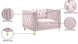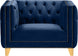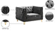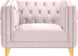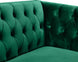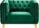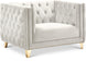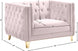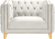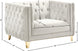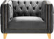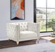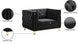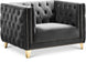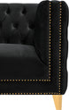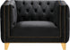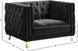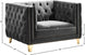 Upholstered in soft black velvet, this Michelle chair is sumptuously glamorous. Designed for upscale living, this chair features rich gold nail head trim and gold iron legs that keep it grounded in contemporary beauty. Tufted material covers every inch of this unit, and button tufting ensures that the unit stays plump and comfortable and holds up well to continual use. Pair it with other items in the collection for a cohesive look.