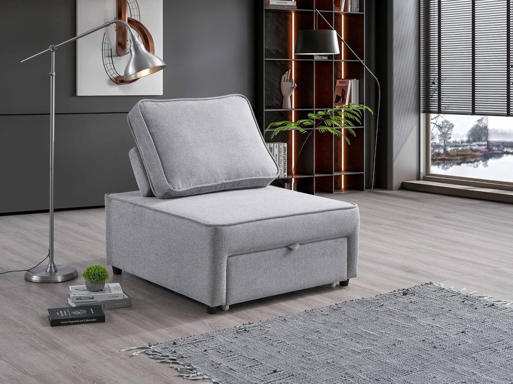 Wrapped in soft grey fabric upholstery with a contemporary appeal, it complements any décor—from minimalist to transitional interiors. Supported by a solid wood frame, this chair bed ensures durability and dependable support for everyday use.