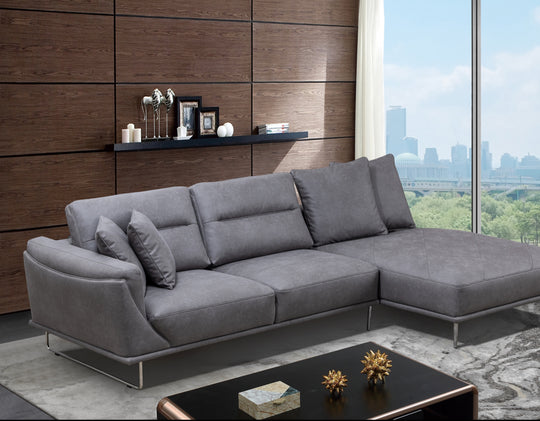 Product Description For a design that marries contemporary appeal to cushioned comfort, you need the Zenia sofa-chaise sectional. A stylish low profile design combined with a neutral grey colour palette accented by chrome legs guarantees the Zinia...Sale price $1,999.00Regular price $2,499.00Sale price $1,999.00Regular price $2,499.00 -