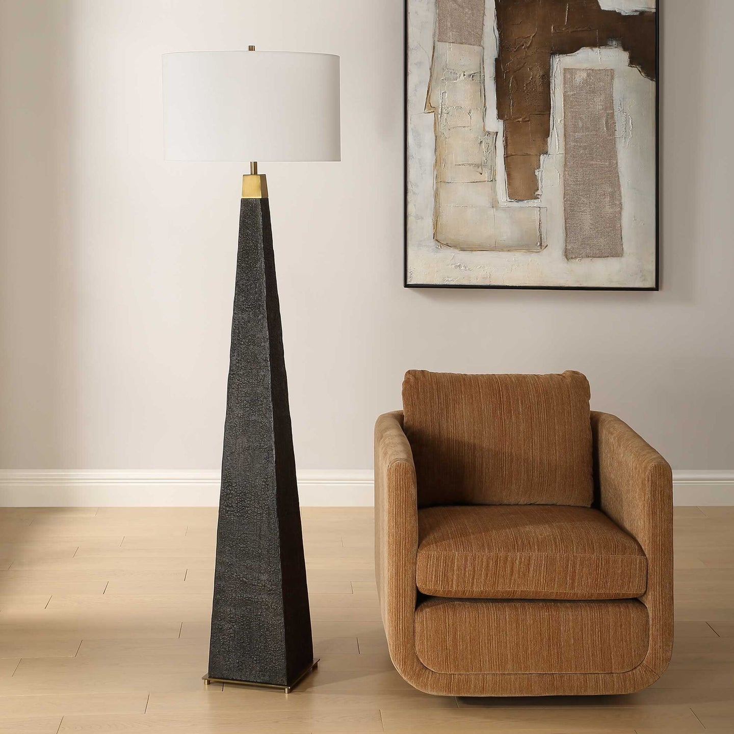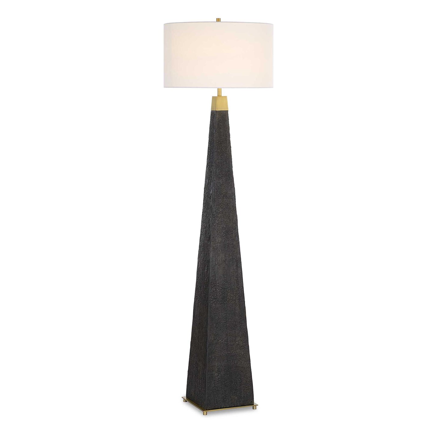 The Lathey Floor Lamp Showcases A Tapered Base With A Burned Wood Look Replicating The Timeless Shou Sugi Ban Technique Of Preserving Wood, Accented With Plated Brass Details. The Round Hardback Drum Shade Is A Casual White Linen Fabric.