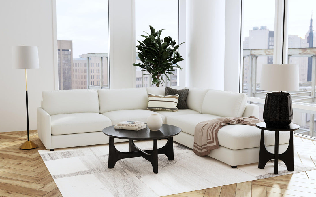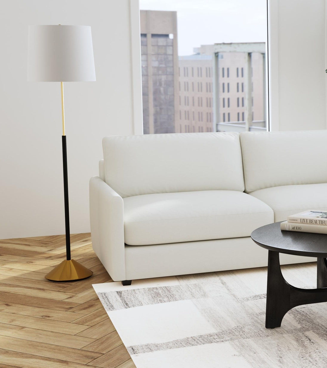 The Sindi Floor Lamp features a slim, streamlined silhouette with a tapered profile. The matte black metal body is complemented by brushed brass accents at the neck and base. Constructed of metal, the lamp is paired with a white linen tapered drum shade.