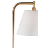 The Telfair Floor Lamp features a slender, arched silhouette with a curved arm and round base. The metal body is finished in gold. Constructed of metal, the lamp is paired with a white linen tapered drum shade.