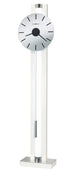 - Contemporary Style: This floor clock features a mirrored dial with a LED illuminated center column and a wood base with a chrome finished top plate. The mirrored dial features hour bar markers and a center disc screened black with the black finished minute and hour hands. Polished chrome-finished pendulum with a cylindrical bob.