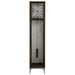 Aged Features: The dial on this wooden grandfather clock features aged, charcoal-finished, wrought-iron Roman numerals, and bar hour markers. These are suspended in front of a machined steel background with aged charcoal finished hour and minute hands. Plain glass adorns the front and sides of the grandfather clock case.