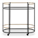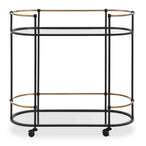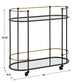 Highlighting A Clean Pill Shaped Design This Bar Cart Brags Of Satin Black Finished Iron Legs Accenting Its Antique Gold Features. Two Plain Mirrored Shelves Act As Stylish Space For Your Favorite Glasses And Sprits. Complete With Rolling And Locking Casters.