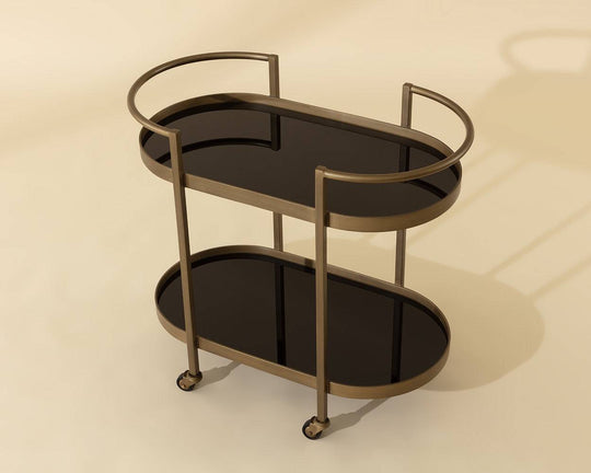 Highlighting a clean pill shaped design this bar cart brags of satin black finished iron legs accenting its antique gold features. Two plain mirrored shelves act as stylish space for your favorite glasses and sprits. Complete...Sale price $689.00Regular price $999.00Sale price $689.00Regular price $999.00 -