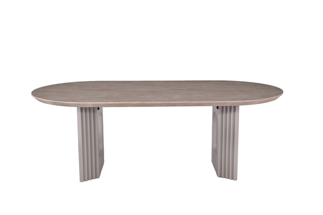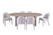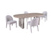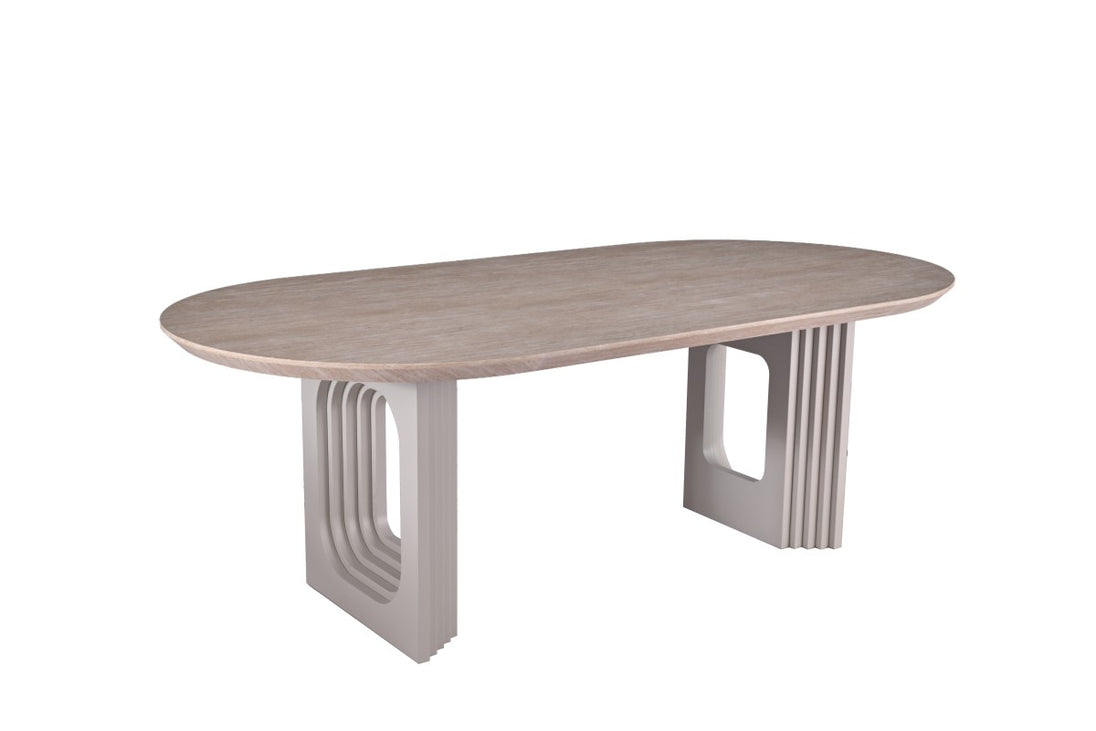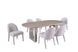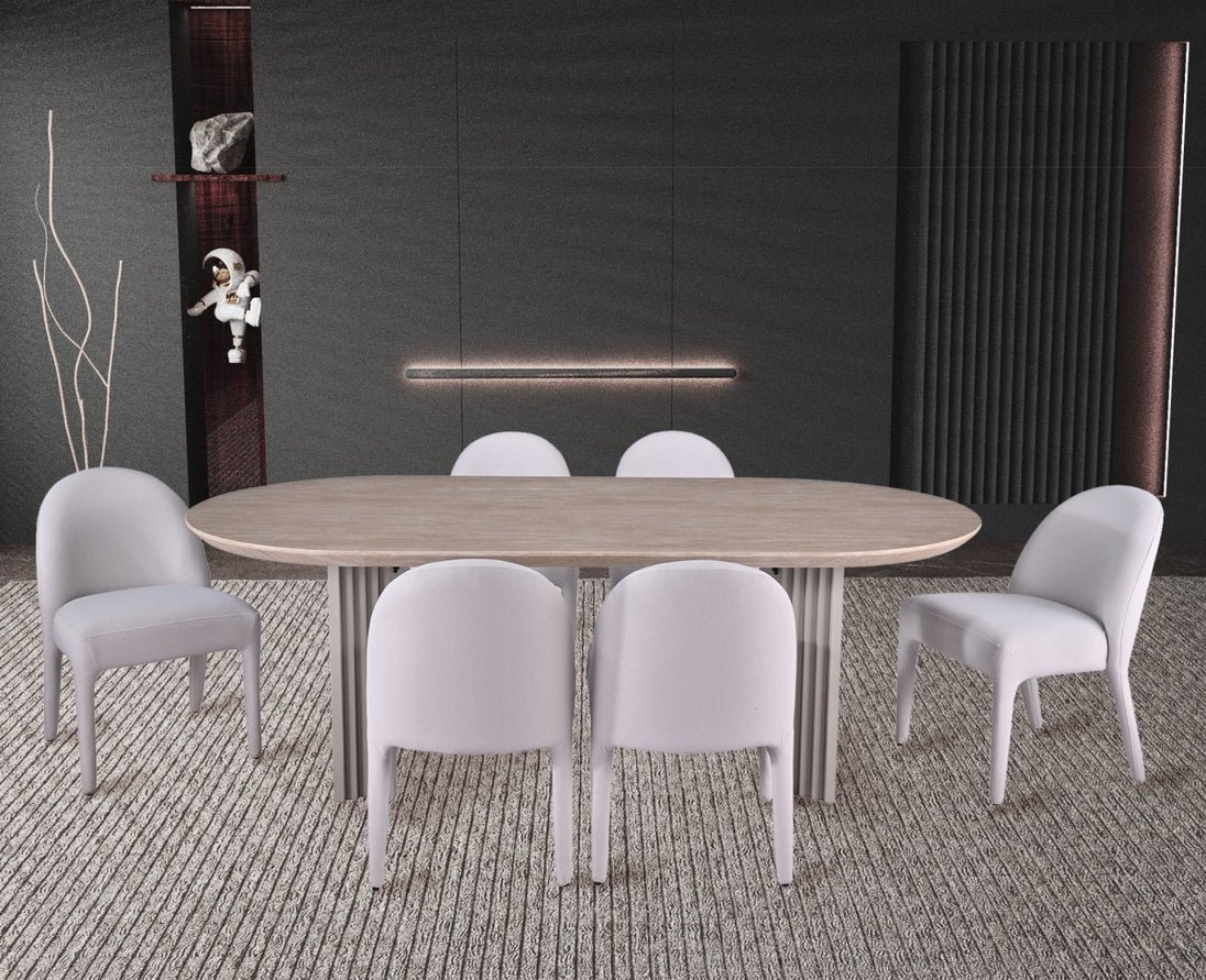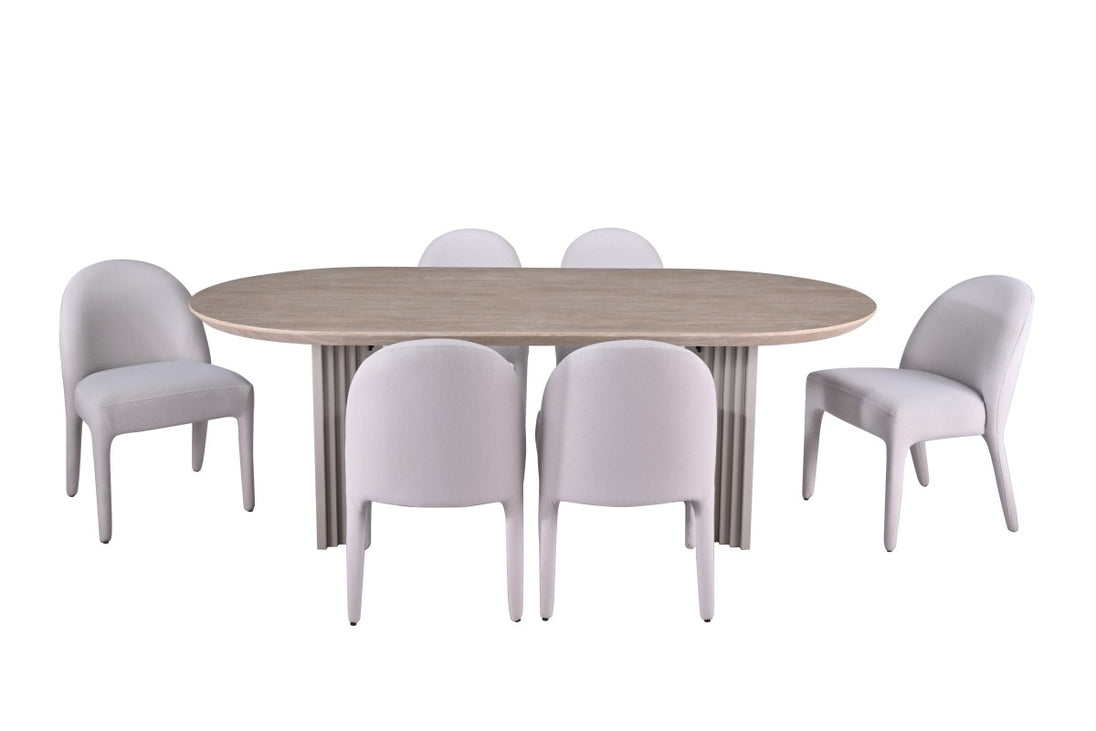 The Dafne 7-Piece Dining Set in beige brings a refined modern aesthetic to any dining space with its bold yet minimalistic design. This set includes a beautifully crafted dining table and four elegantly upholstered chairs. The table features striking pedestal legs with an artistic cut-out design, finished in a sophisticated contrast matte paint that enhances its contemporary appeal. The chairs are designed with curved backrests and plush seating, offering both style and comfort. Wrapped in a soft, textured fabric, the set invites a warm and welcoming atmosphere perfect for both everyday meals and special gatherings.