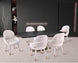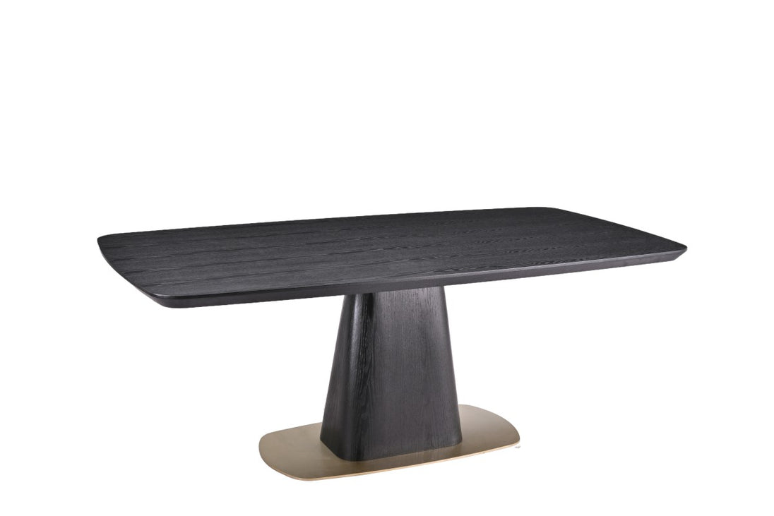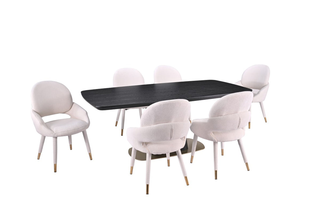 The Demetri 7-Piece Dining Set in beige brings a refined modern aesthetic to any dining space with its bold yet minimalistic design. This set includes a beautifully crafted dining table and four elegantly upholstered chairs. The table features striking pedestal legs with an artistic cut-out design, finished in a sophisticated contrast matte paint that enhances its contemporary appeal. The chairs are designed with curved backrests and plush seating, offering both style and comfort. Wrapped in a soft, textured fabric, the set invites a warm and welcoming atmosphere perfect for both everyday meals and special gatherings
