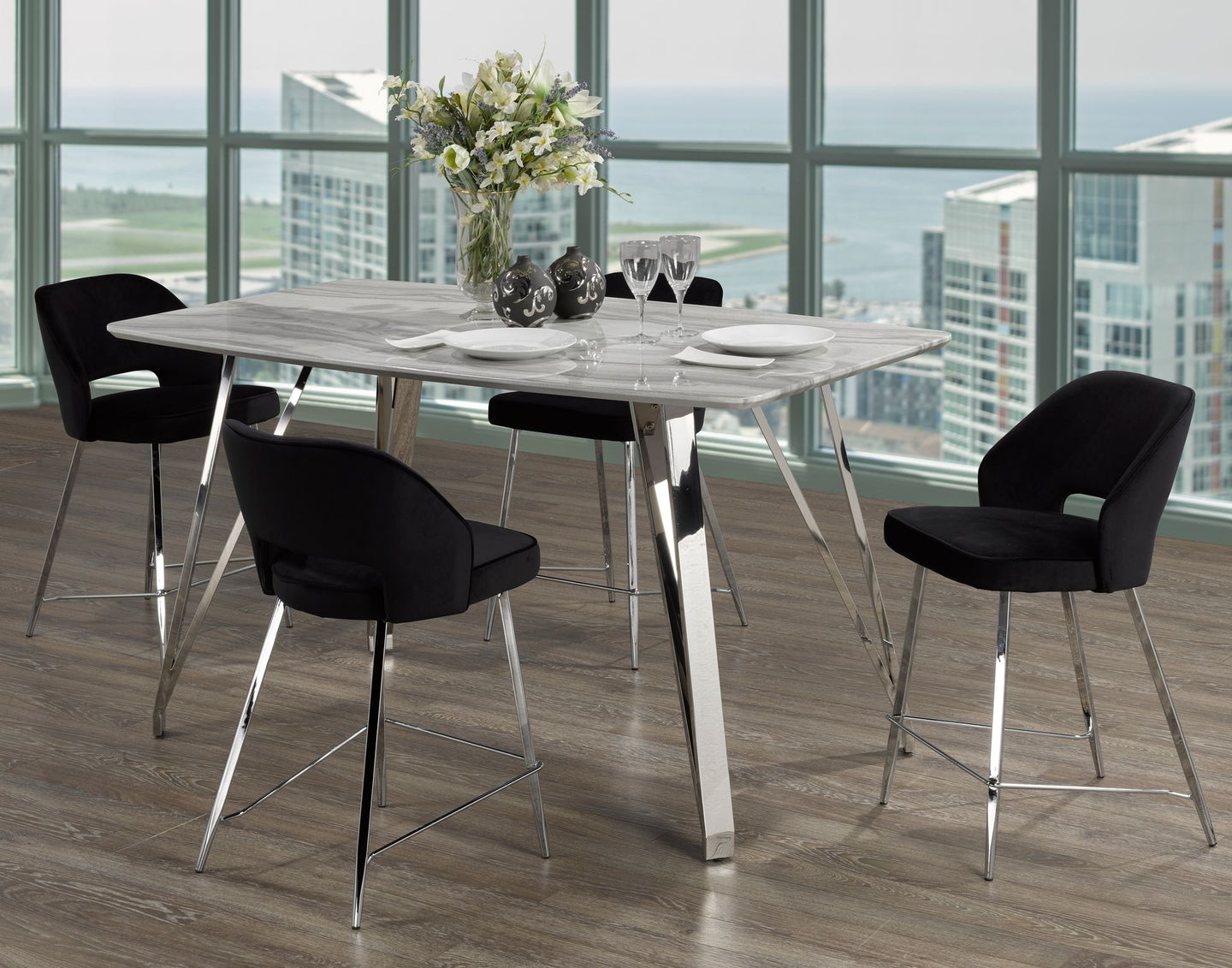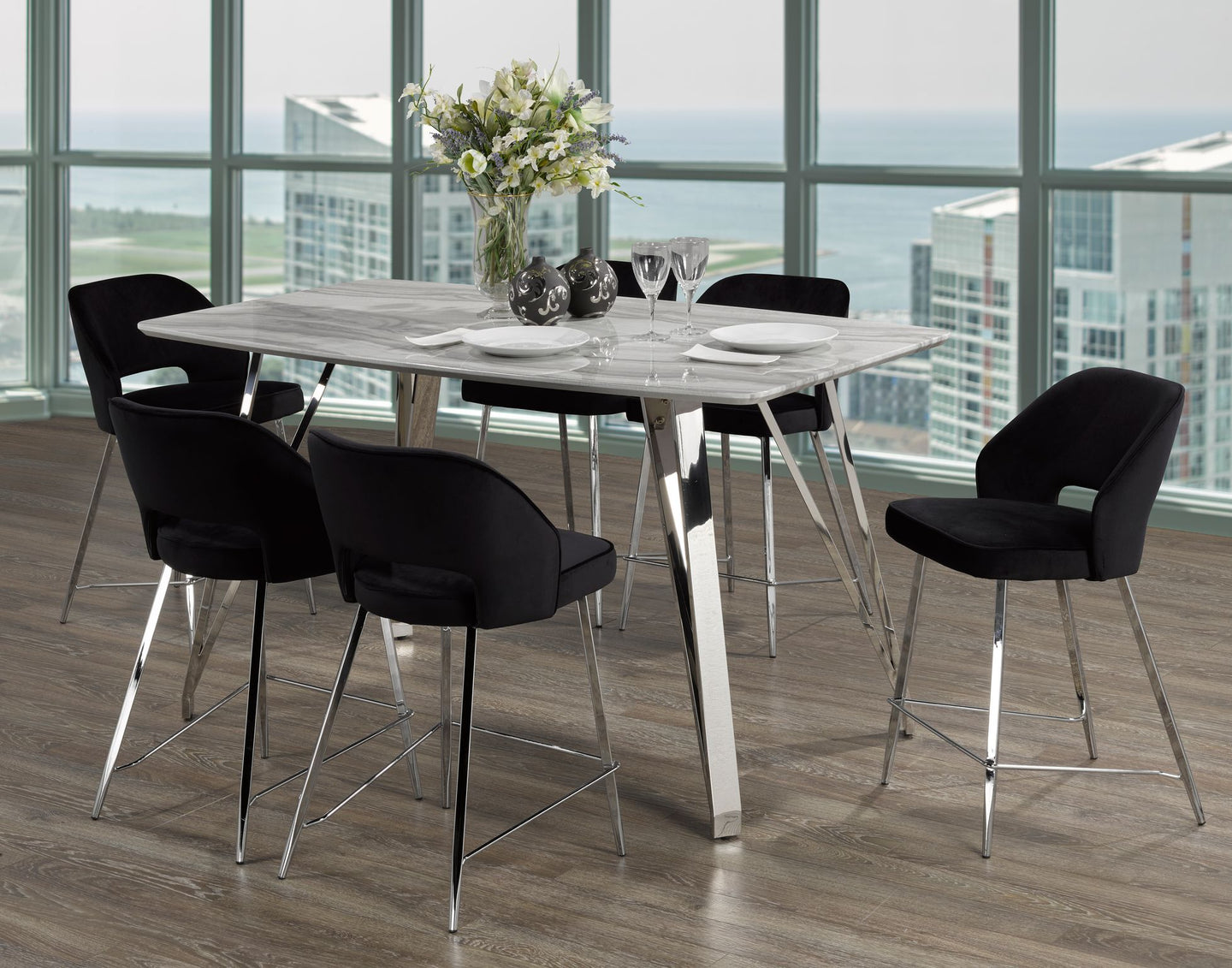 The contemporary Ella dining set commands attention with its stylish, modern design. Including a table and 6 counter stools, the tabletop features a durable paper marble on a white canvas with grey cascading veins. The top is supported by eye-catching splayed legs with a contemporary chrome finish, ensuring for a stunning dining table with enduring quality and long-lasting comfort in mind. The gorgeous matching counter stools, wrapped in premium fabric, feature a contoured back to provide optimum support and relaxation.