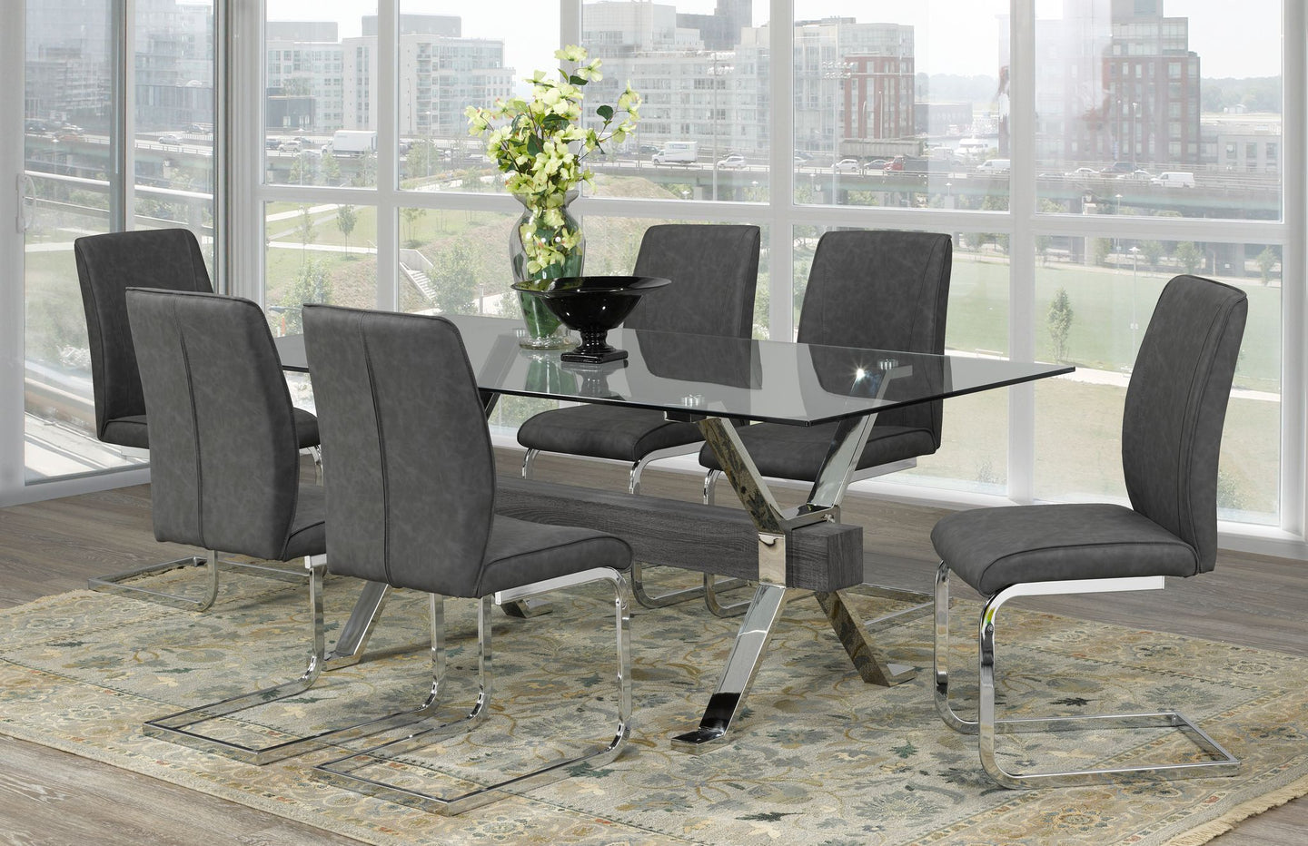 The Ezra dining series brings elegant, contemporary styling to your home. Perfect for both casual family gatherings and formal dinner parties with friends, the attractive set features a rectangular trestle table and six armless chairs. Built to last, the table has a sturdy chrome-plated frame and tempered glass tabletop. The comfortable, curved high-back chairs feature chrome-plated legs that complement the eye-catching table base. Metal, glass and leather materials combine to create a stunning modern look in a neutral shade of grey that effortlessly fits in with a wide range of interiors.