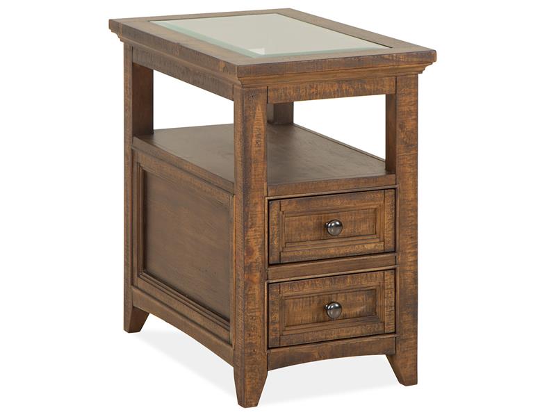 - 5mm tempered clear glass w/ 1" bevel insert on wood top.