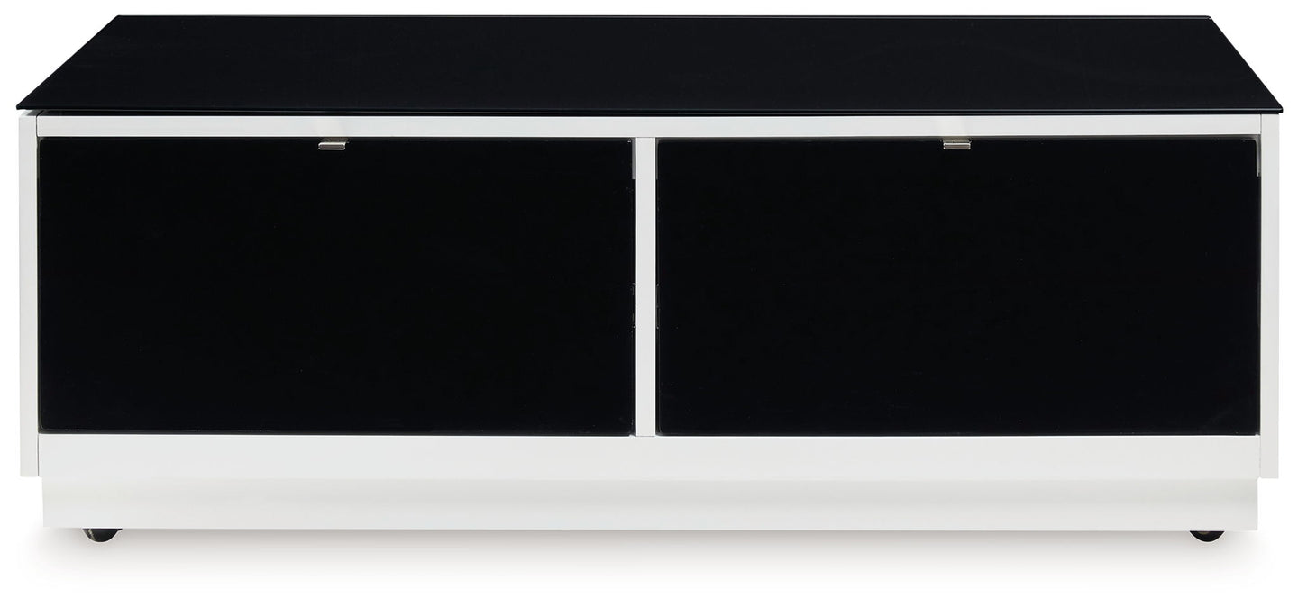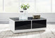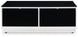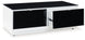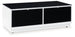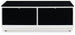 - Black glass tabletop; black acrylic laminate drawer fronts