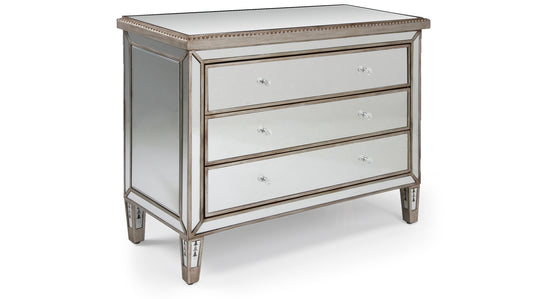Maggiore Dresser Items AvailableDresser: 38" L × 16" D × 29" H Features Elegant mirrored chest 3 drawers Clear acrylic knobs Solid wood frame Antique champagne finish Antique mirror top and facingsSale price $799.00Regular price $1,499.00Sale price $799.00Regular price $1,499.00 -