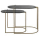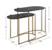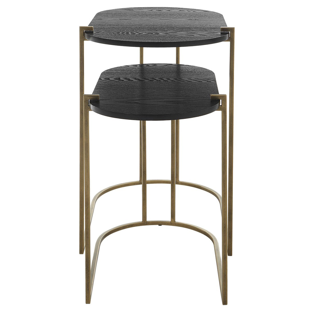 The Aztec tables are crafted with iron frames in antique brass, encapsulating oval tops in an ebony stained ash veneer. Sizes: S-22"x11"x18", L-27"x14"x22"