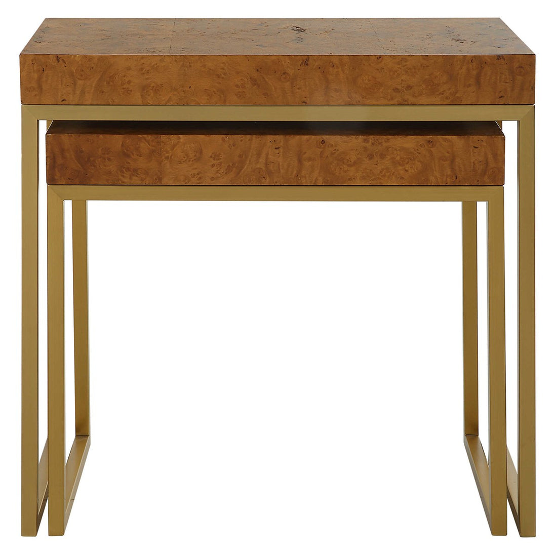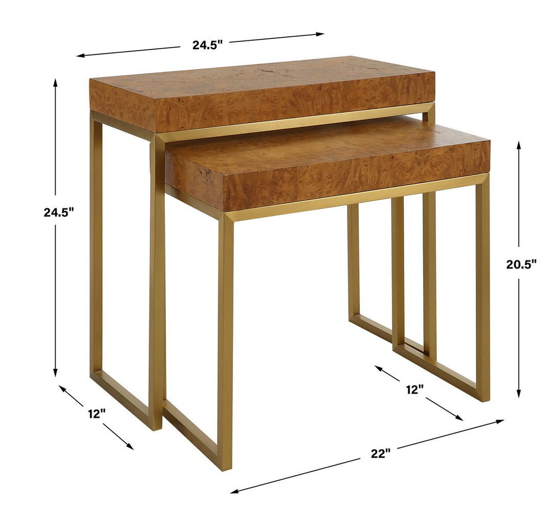 Timeless yet modern, the Burl-esque Nesting Tables feature mappa burl veneer in rich pecan with subtle sheen. The streamlined bases pair beautifully in brushed brass stainless steel.