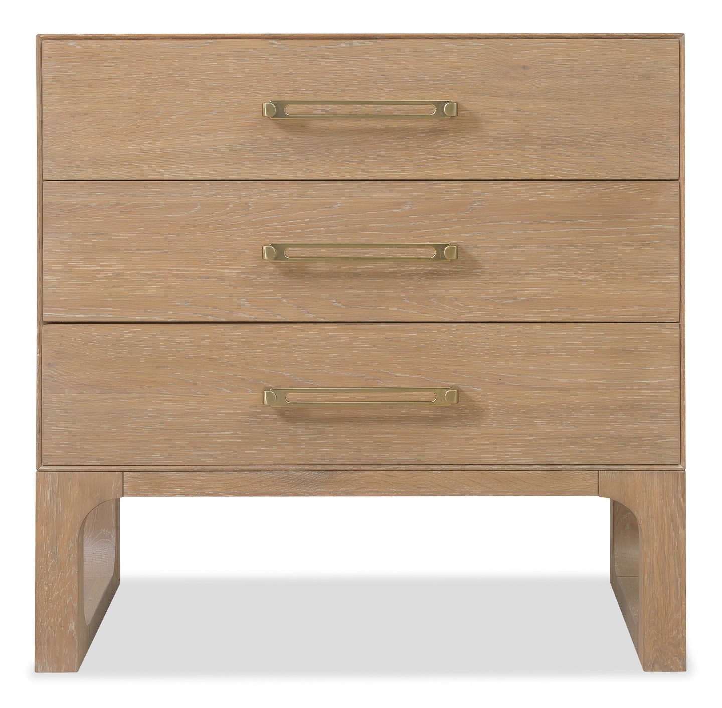 The Banyon Bay Three Drawer Nightstand brings functionality and style to your bedside. Constructed from white oak solids and oak veneers with a light Desert Oak finish, it features wire-brushing and cerusing for a textured appearance. The brushed brass stainless steel bar hardware adds a modern touch. With three spacious drawers, an integrated charging station, and a USB port, this nightstand is both practical and stylish. It is the perfect companion for contemporary bedrooms, blending sleek design with natural materials.