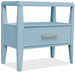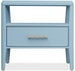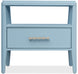 Finished in painted blue with pewter hardware, this nightstand includes one self-closing drawer and open shelf storage.