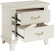 Specifications: Made of wood and engineered wood. Champagne finish. Embossed, textural panels with mirror trim. 2 dovetail drawers with ball bearing glides. Champagne tone drop handles. No assembley required. Prop 65 Information.