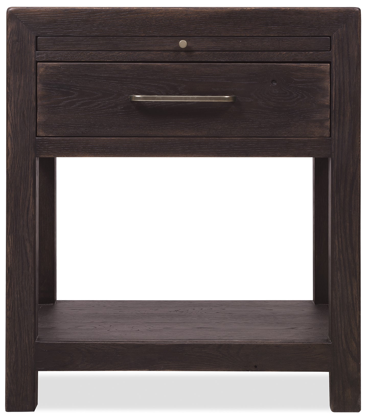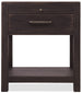 The Driftwood One-Drawer Nightstand in Burnt Timber, a dark and dramatic finish, combines practicality and style. It includes a self-closing drawer, a pull-out shelf, and a fixed bottom shelf, along with a cord clip for organization.