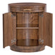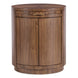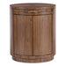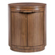 The Eleana Round Nightstand features a beautiful starburst veneer top, touch-latch wood doors, and a pull-out tray for added versatility. Finished in Light Caramel walnut veneers with Sunlit Bronze hardware, this piece is perfect for adding warmth and luxury to any bedroom.