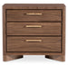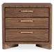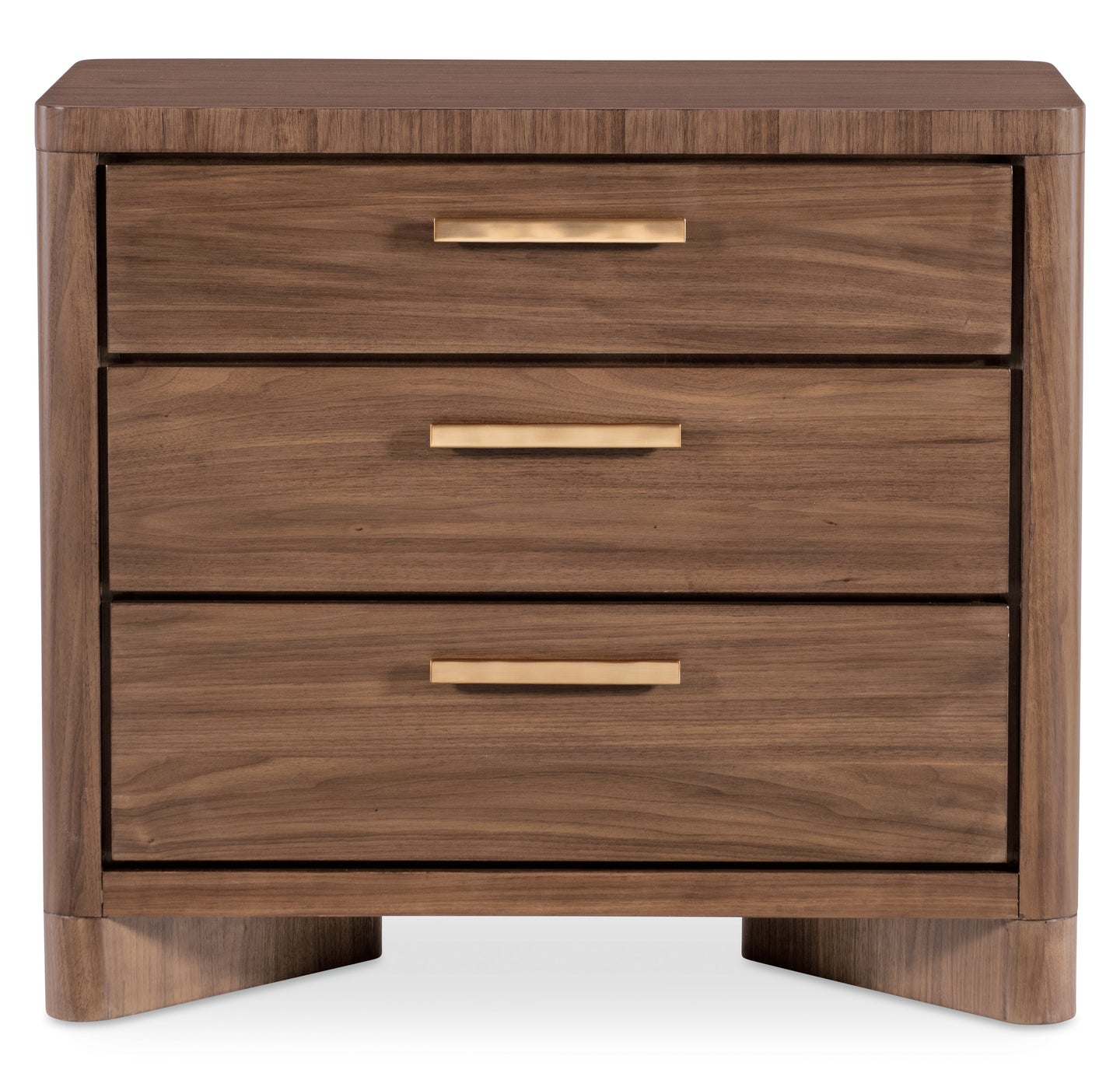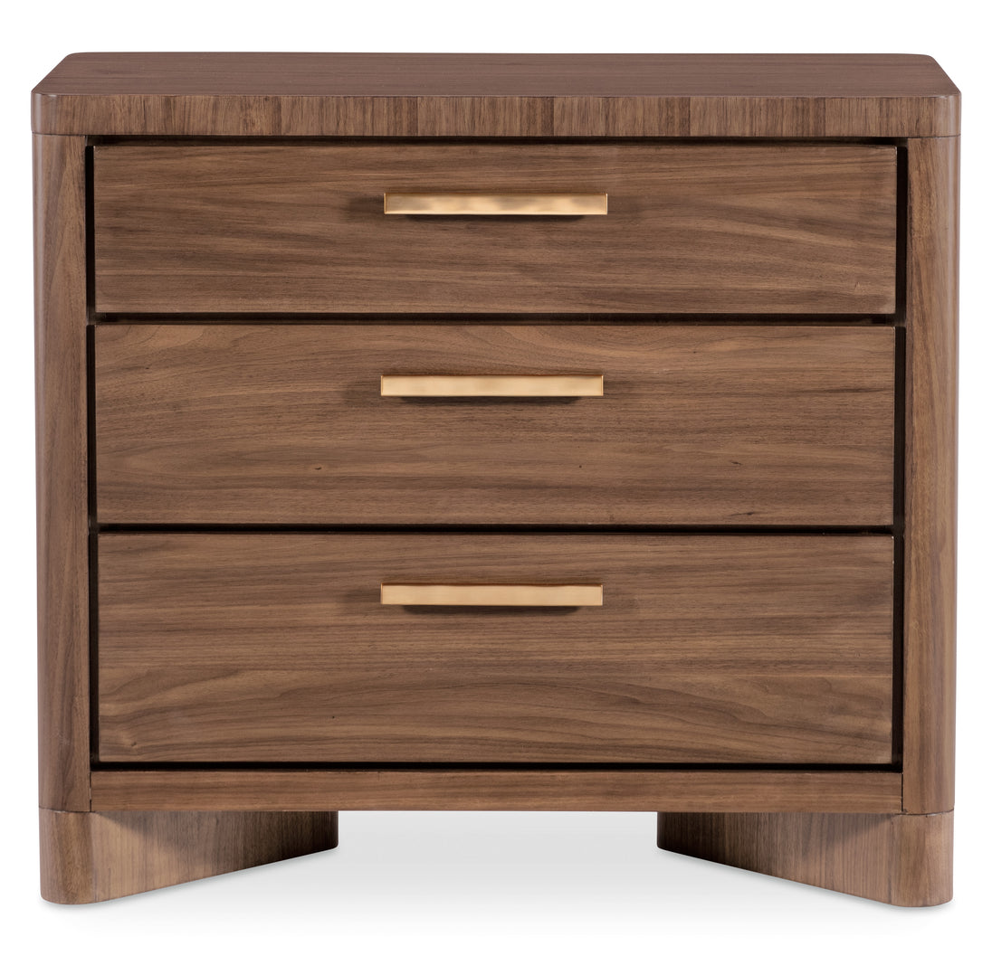 Designed for convenience and style, the Eleana Three Drawer Nightstand features Light Caramel walnut veneers, plated bronze hardware, and rounded corners. Its integrated charging station with dual outlets, along with three self-closing drawers, makes it both functional and luxurious for bedside storage.