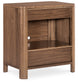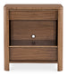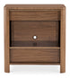 The Eleana Two Drawer Nightstand offers refined storage with its Light Caramel walnut veneer finish and Sunlit Bronze hardware. With two self-closing drawers, an integrated charging station, and discreet wire management, this nightstand balances style and modern functionality.