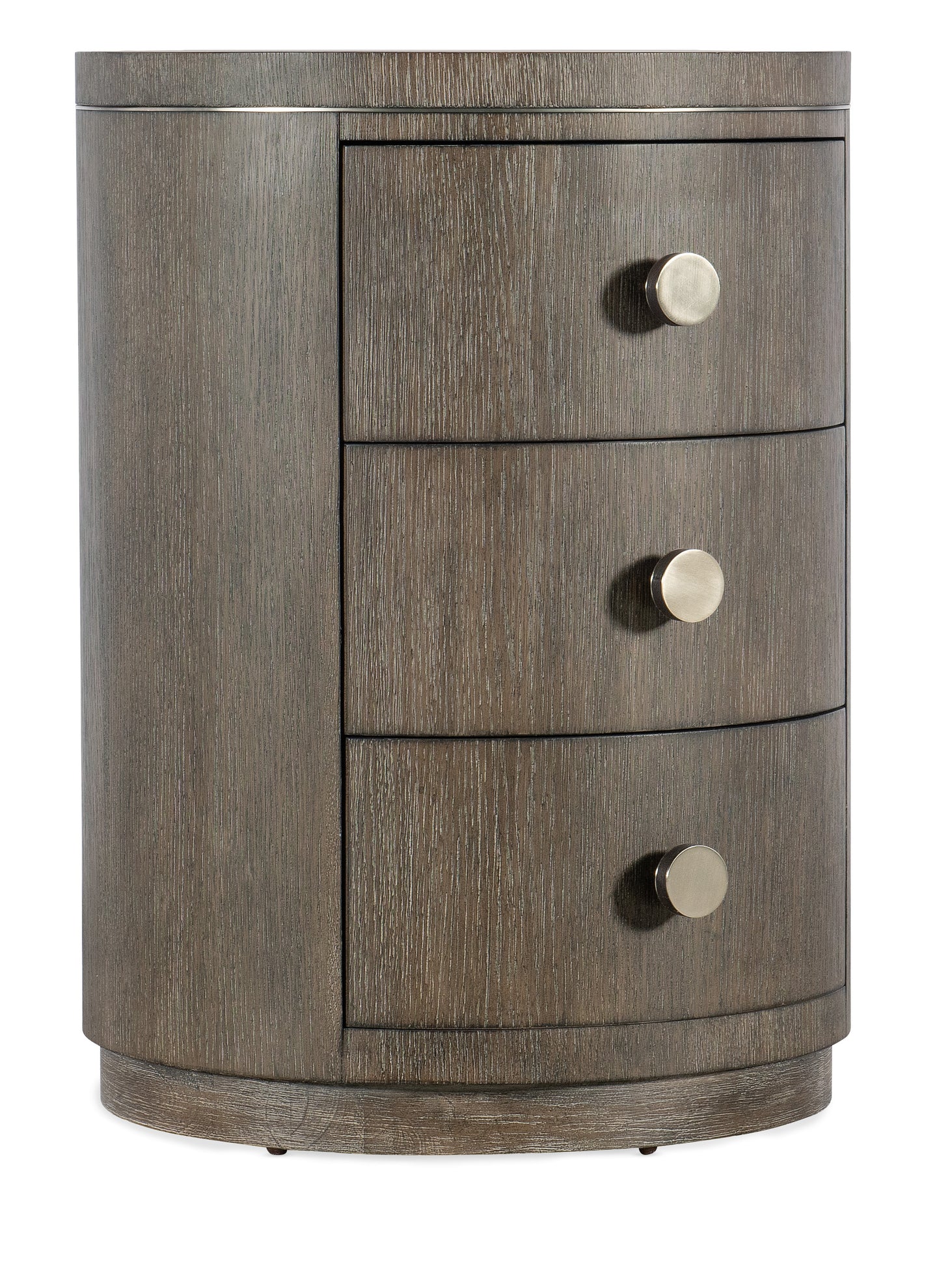 Serene, symmetrical and softly-sophisticated, the Modern Mood Round Nightstand has a clean modern profile and luxe mixture of materials. Offering three self-closing drawers, the nightstand is crafted of Oak Veneers in a dark Mink finish and has a striking matched veneer top. With metal trim, the knobs are accented by leather.
