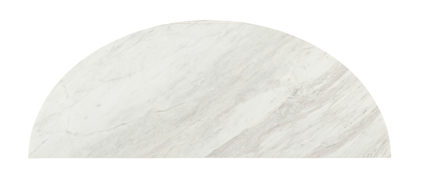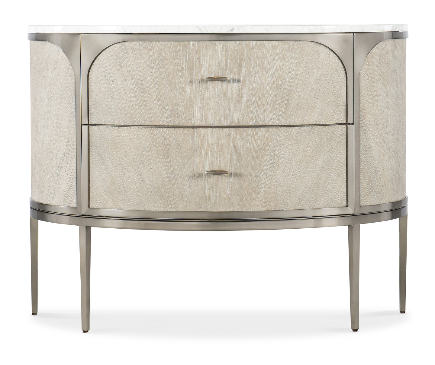Architectural and timeless with a luxe mixture of materials, the Modern Mood Nightstand is a statement piece. Featuring a demilune shape and two self-closing drawers, the nightstand has a metal frame, legs and slender pulls and a white and gray marble top. The case is crafted of Oak Veneers and finished in the crystal-like Diamond Color with wire-brush detailing.
