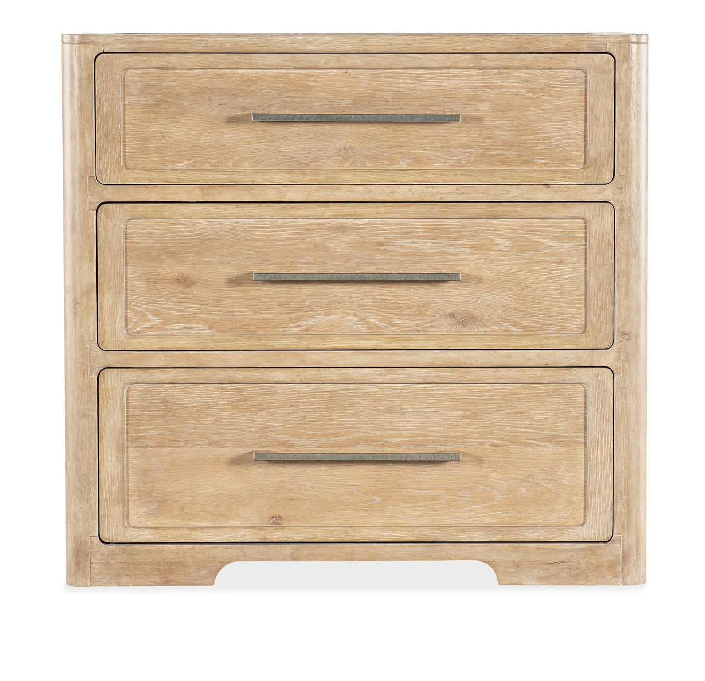 The Retreat Nightstand has a tranquil personality with a modern twist and organic, textured pewter bar pulls. Crafted of Oak and Maple Veneers, it is finished in the sand-colored Dune, transparent by design to showcase the unique grain patterns of the veneer. Featuring three self-closing drawers, the nightstand is elevated on shaped block feet.