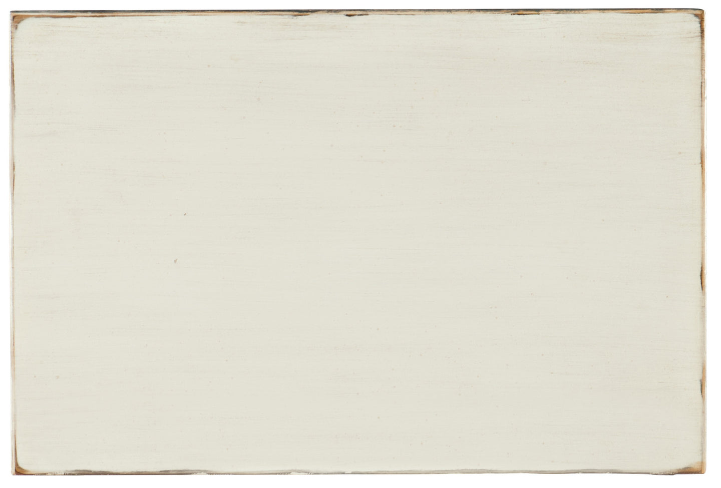 - Finish: Blanc, a creamy white finish accented with champagne and silver tipping. Distressing includes drawknife, wormholes and stoning. Antique silver colored metal alloy custom decorative pull designed to look like a piece of jewelry.