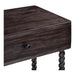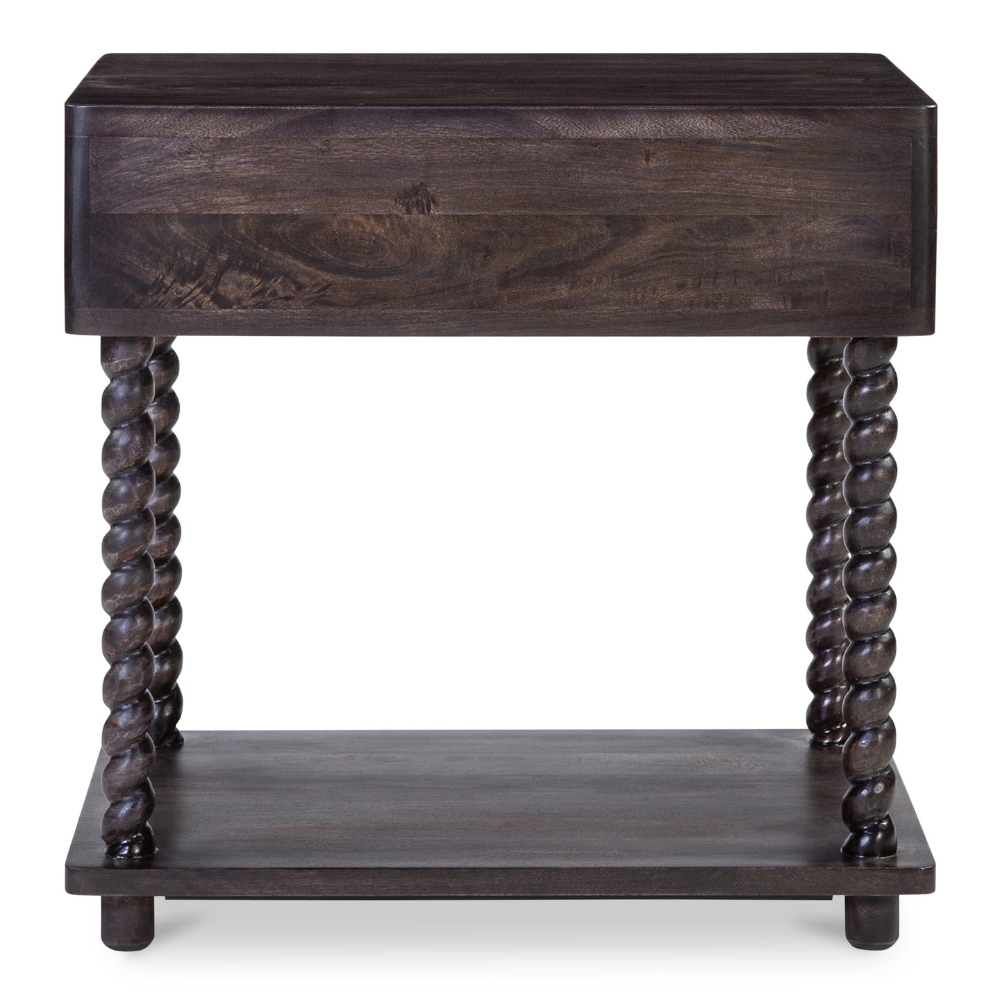 Made from mango wood, the Tabitha nightstand showcases exquisite craftsmanship with its delicately turned legs, highlighted by tight, intricate spirals. Accented with a sleek black iron handle, this piece not only provides traditional elegance but also functional design with a lower shelf for added storage.