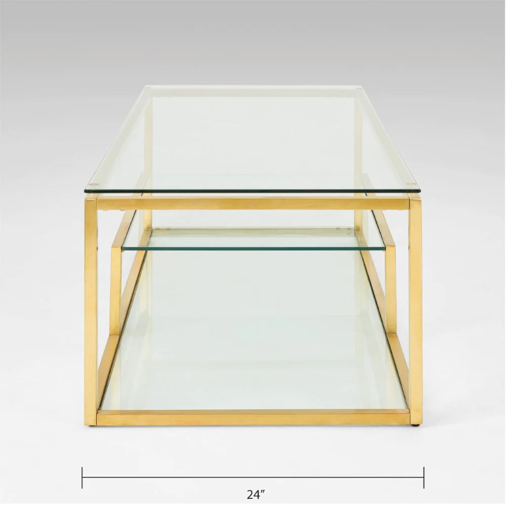 Simply chic. The Barolo coffee table offers three levels of tempered glass to achieve maximum storage and display. The multi-level design adds layers and complexity to your living room space. Combined with a brilliant brushed gold stainless steel base, this coffee table offers more than just functionality. The notably open and contemporary design adds a touch of glamour to your interior design. Shop the entire Barolo collection for an easy solution to your home decor space.
