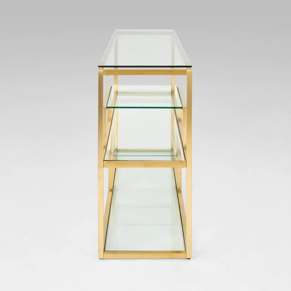 Simply chic. The Barolo console table offers up to five levels of tempered glass to achieve maximum storage and display space. The multi-level design adds layers and complexity to your living room space. Combined with a brilliant brushed gold stainless steel base, this coffee table offers more than just functionality. The notably open and contemporary design adds a touch of glamour to your interior design. Shop the entire Geneva collection for an easy solution to your home decor space.