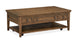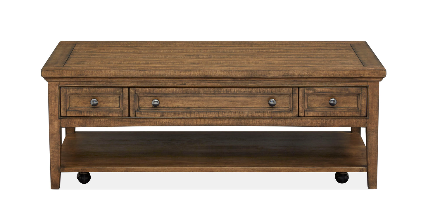 Bay Creek - Rectangular Cocktail Table With Casters. 3 drawers. 1 fixed bottom wood shelf. Tinted drawers with french dovetail in front & english in back. Side mount ball bearing guides. Casters.