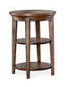 Bay Creek - Round Accent End Table. Wood top. 2 fixed bottom wood shelves. Floor protectors.