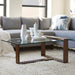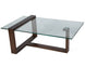 In a striking modern example of mixed materials, Bristow creates chic sophistication. Smooth, sleek glass tops are supported by Acorn finished Mindi wood interlocking rectangles and are punctuated with chrome metal pucks. A chunky wood rectangle overlaps the top at one end as the other understated rectangle base rests underneath on the conversation worthy cocktail, impressive open sofa table and the rectangular end table with geometric appeal that delightfully complement contemporary living spaces.