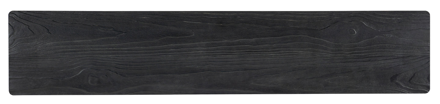 Casual with a modern, sophisticated flair, the Chapman Console has a slender and shaped silhouette and is crafted of Pine Veneers in a Charred Black Finish with the look of burnt wood with hand-hammered pewter ferrules. At a slim 16 inches deep, the console is versatile for a variety of spaces.