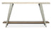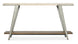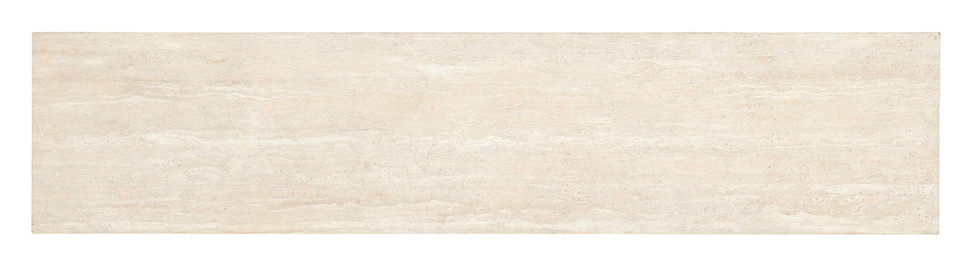Modern materials meet timeless surfaces in the mixed-media Boomerang Console Table. With an eclectic elegance, the 61-inch-wide table combines a Travertine marble top with a metal frame and legs and one wood fixed shelf. Crafted of Oak Veneers, the marble top is cream colored with a natural medium wood finish and gray metal frame and splay legs.