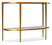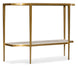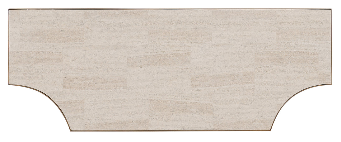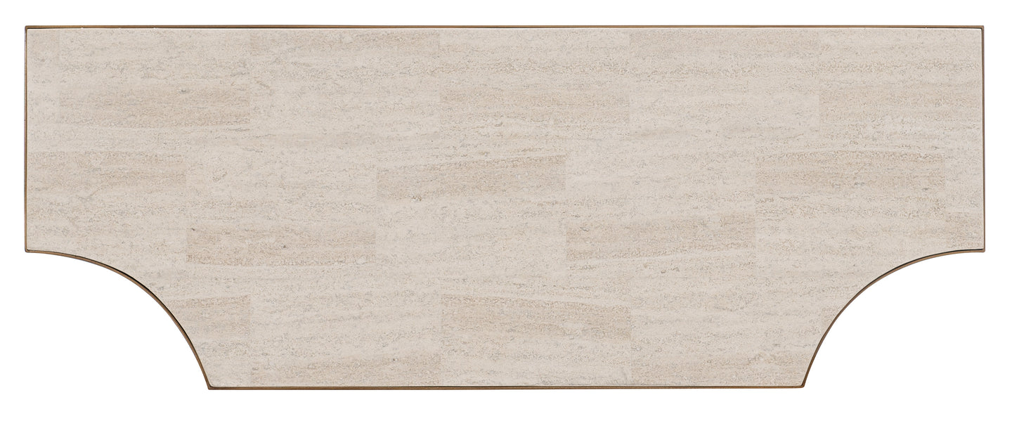 With understated opulence, the delicately-scaled Commerce & Market Console Table combines White Travertine Stone on the shaped top and bottom shelf with a gold-colored metal frame.