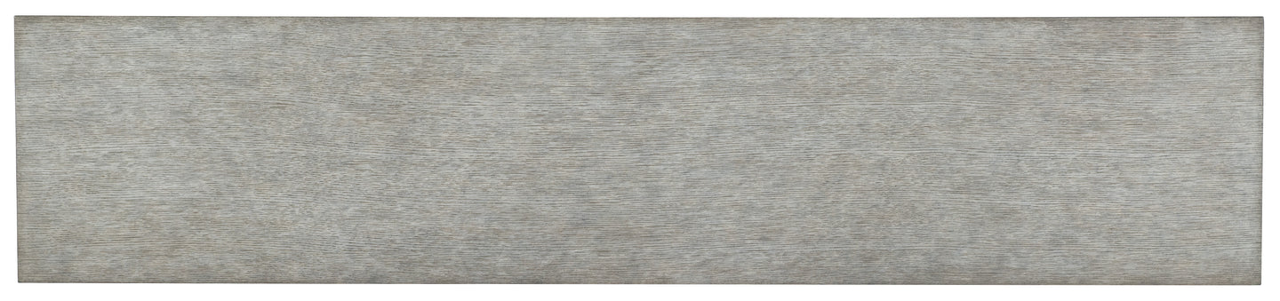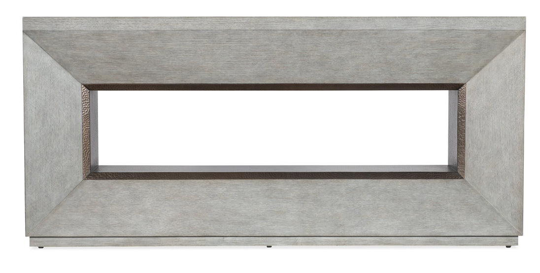 A sleek silhouette is combined with a mix of casual organic materials in the Passage Console. Crafted of Oak Veneers, it has hammered antique brass metal accent on the open area and a plinth base. Measures 74 inches wide by 16 inches deep.