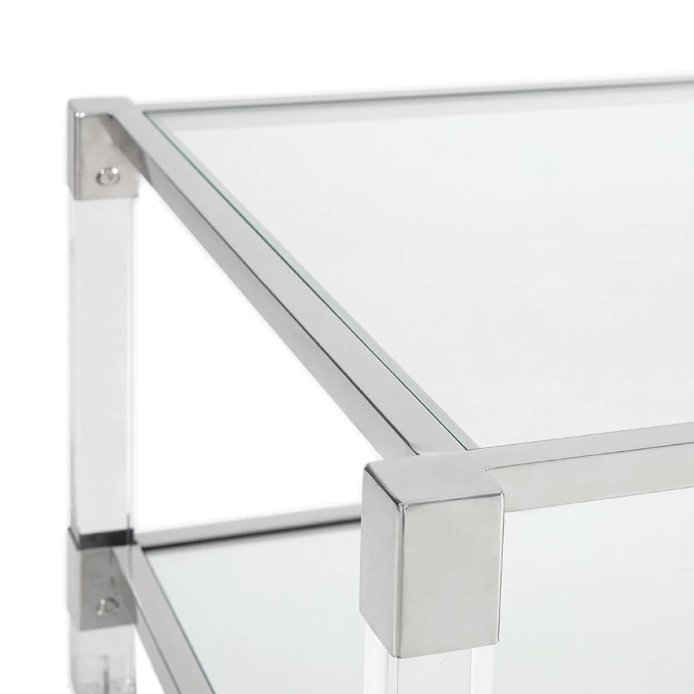 Expertly crafted and with stunning visual appeal, the Dudley coffee table instantly creates an open and airy vibe. The subtlety of its intricacies brings focus to your accent pieces and overall living spaces. The robust coffee table combines acrylic legs, a polished stainless steel frame, a tempered glass top, and a mirror base. Perfectly versatile, the Dudley coffee table will complement any of your existing decors. Pair it with the matching end and console table for a put-together look.